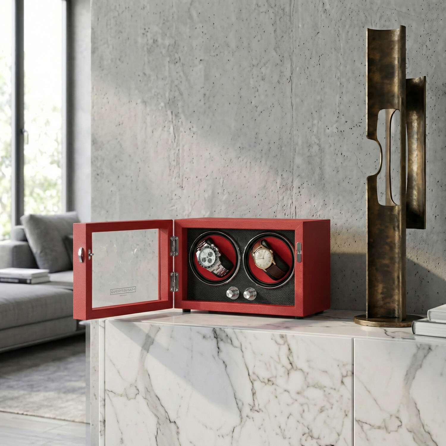 CASE MATERIAL: MEDIUM DENSITY FIBRE BOARD CASE COLOR: RED LINING MATERIAL: PVC LINING COLOR: GREY SIZE: (W)26.5*(L)16.3*(H)17.6CM WEIGHT: 2.7KGS FEATURES: SEE-THROUGH GLASS DOOR/MULTIPLE POWER SOURCE OPTIONS FIT WATCH UP TO: 55-60MM INPUT VOLTAGE: 110 - 240 BATTERY POWER: NOT AVAILABLE MOTOR MODULE: INDIVIDUAL MOTOR PER MODULE/HIGH QUALITY MOTOR ROTATION DIRECTION: CLOCKWISE, COUNTER-CLOCKWISE ROTATIONS PER DAY: DEPENDS ON ACTUAL RUNNING TIME INCLUDED: - BLACK INNER CARTON WITH MAINSPRING LOGO - DUST BAG - MS-IFCARD-01 - MULTI ADAPTERS INCLUDING UK/USA/EU PLUGS