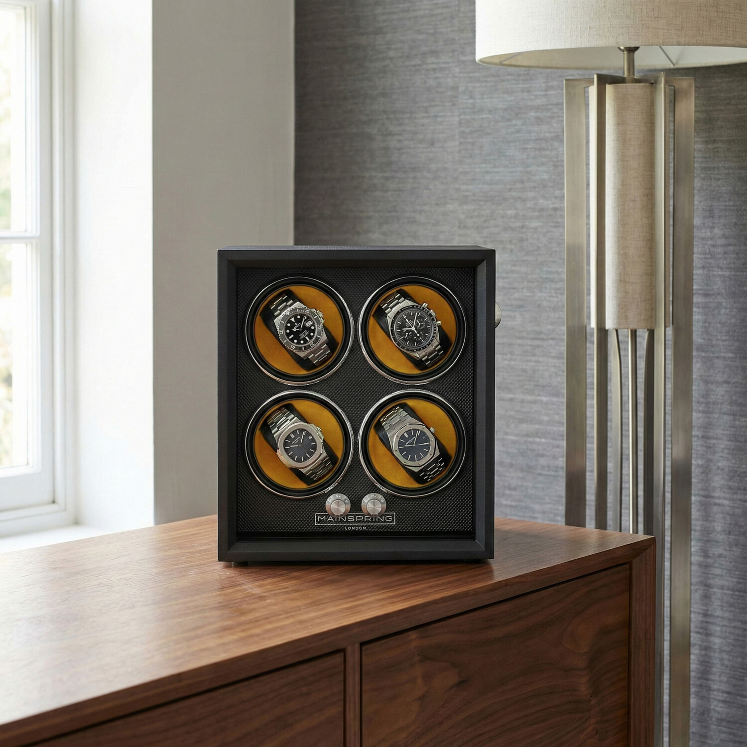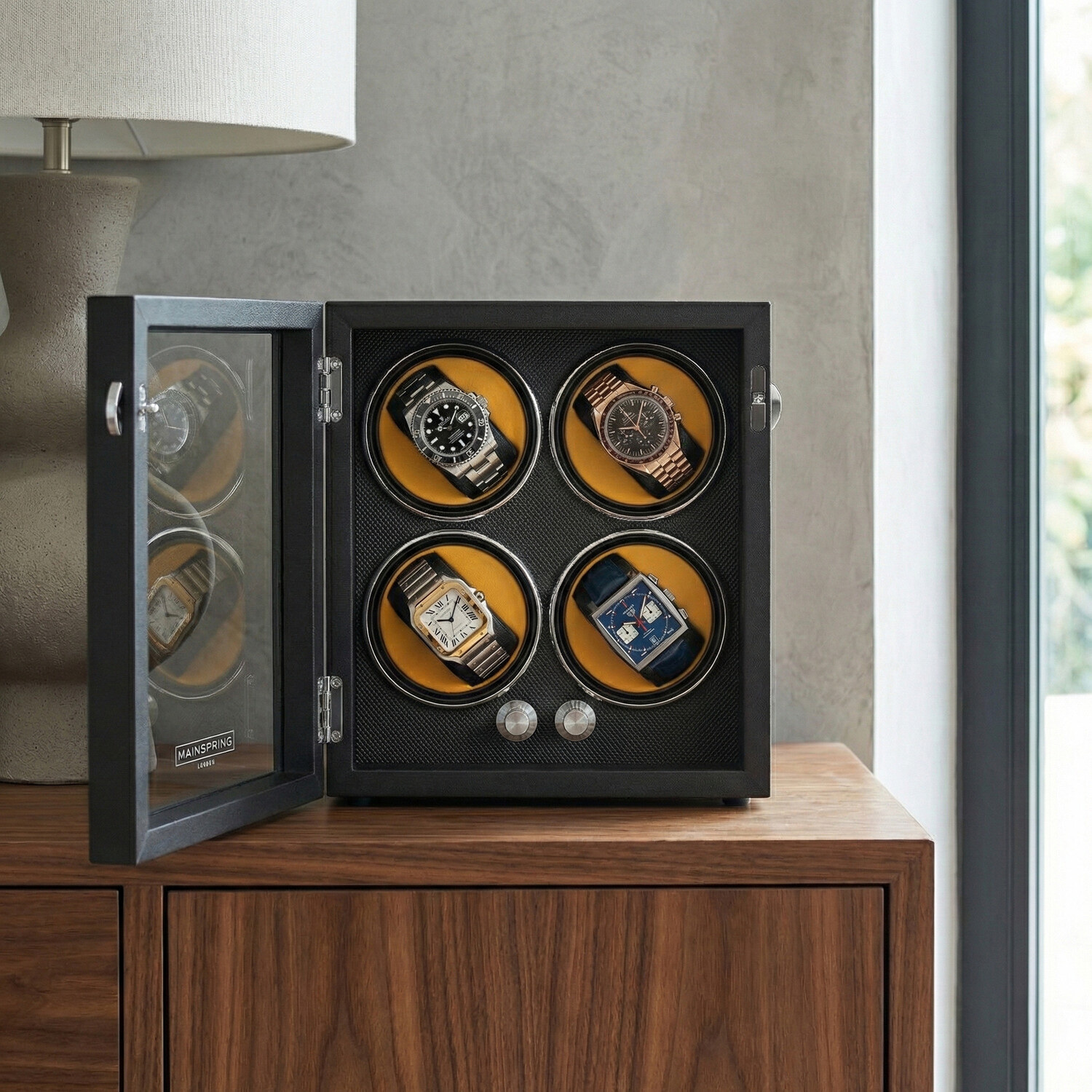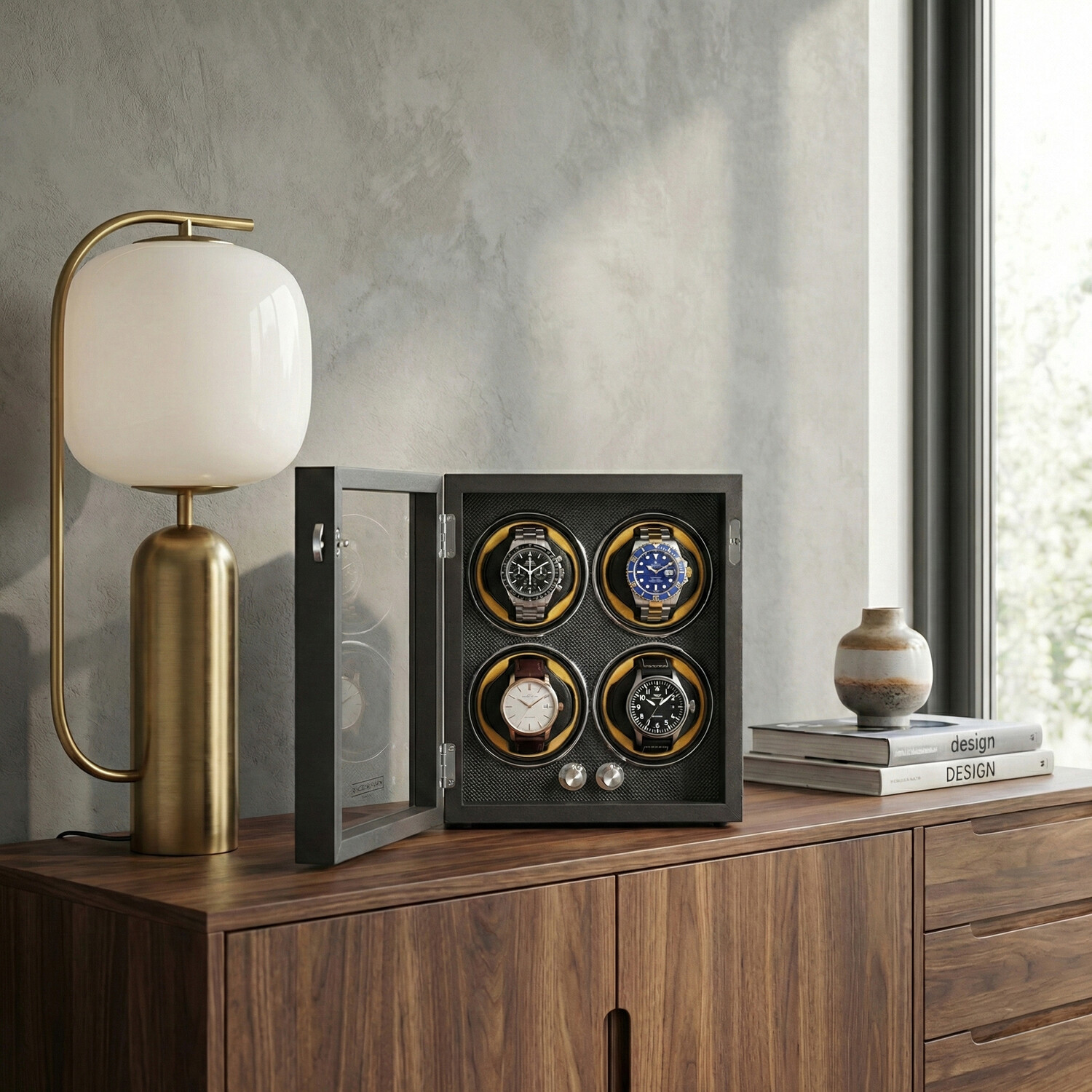 CASE MATERIAL: MEDIUM DENSITY FIBRE BOARD CASE COLOR: BLACK LINING MATERIAL: PVC LINING COLOR: GREY SIZE: (W)26.5*(L)16.3*(H)30.6CM WEIGHT: 4KGS FEATURES: SEE-THROUGH GLASS DOOR/MULTIPLE POWER SOURCE OPTIONS FIT WATCH UP TO: 55-60MM INPUT VOLTAGE: 110 - 240 BATTERY POWER: NOT AVAILABLE MOTOR MODULE: INDIVIDUAL MOTOR PER MODULE/HIGH QUALITY MOTOR ROTATION DIRECTION: CLOCKWISE, COUNTER-CLOCKWISE ROTATIONS PER DAY: DEPENDS ON ACTUAL RUNNING TIME INCLUDED: - BLACK INNER CARTON WITH MAINSPRING LOGO - DUST BAG - MS-IFCARD-01 - MULTI ADAPTERS INCLUDING UK/USA/EU PLUGS