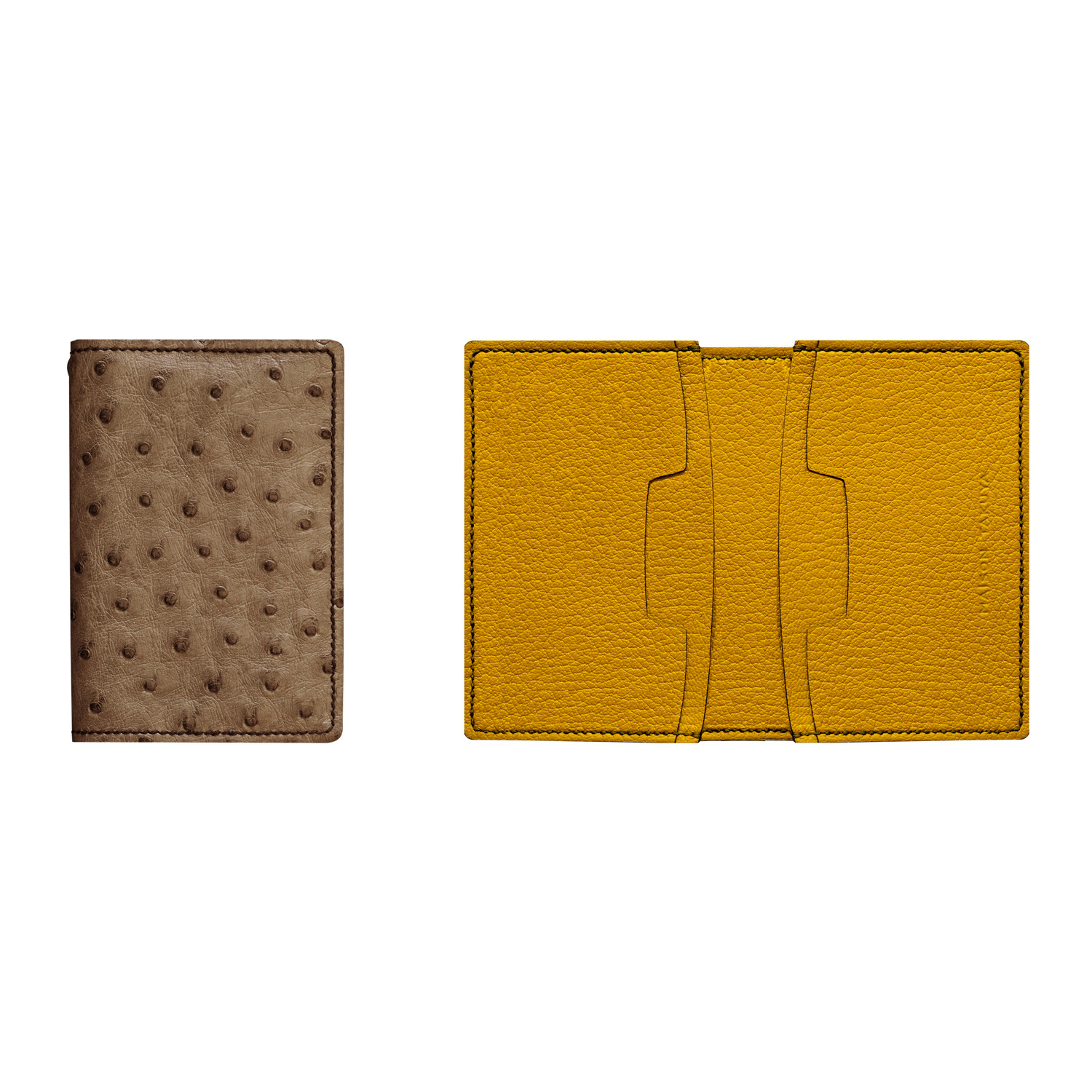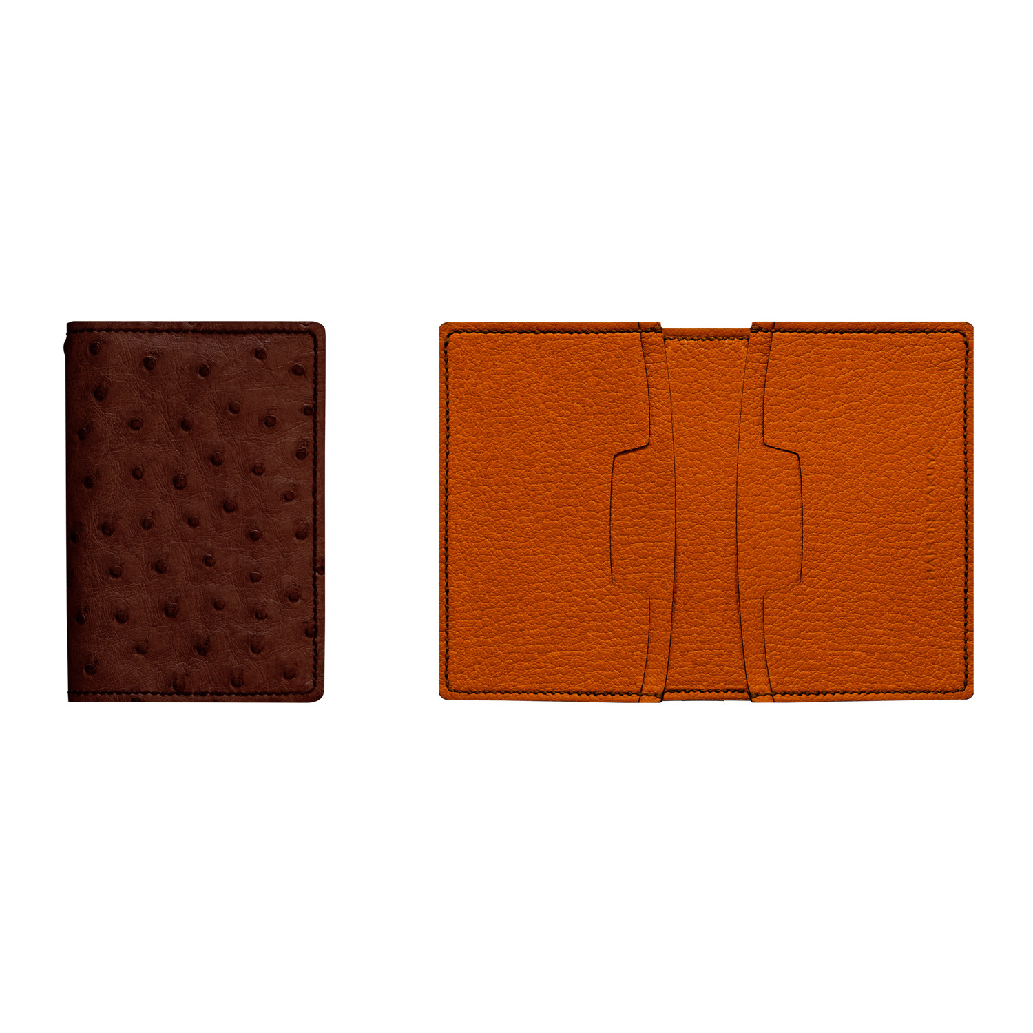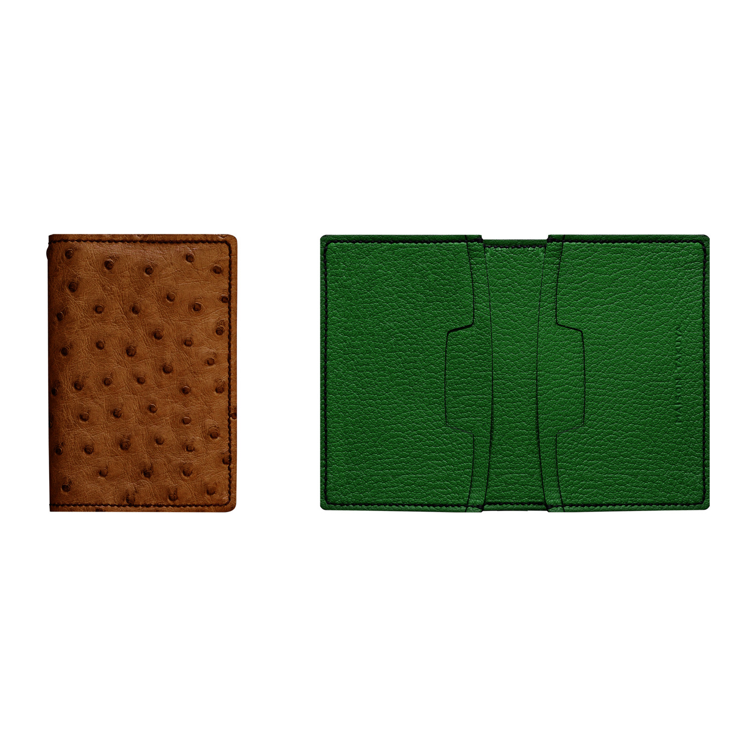 Maison Takuya's Business Card Pouch is a luxurious folding leather pocket with an ostrich exterior and ultra-soft goat leather interior. Maison Takuya only uses the highest grade Australian skins, tanned with a semi-matte finish that allows a rich patina to develop over time. This design is ideal for stylish business professionals who want an attractive way to keep their business cards organized, either tucked away in a suit pocket or easily tossed in a travel bag.