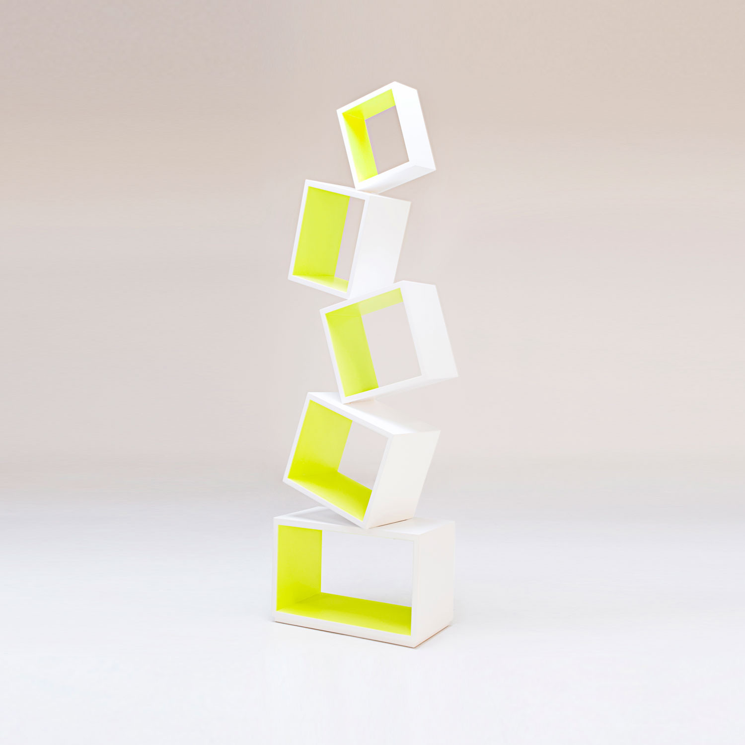 The Equilibrium's off kilter silhouette is surprising and exciting in your home. This bookshelf has cantilevered nodules that are stacked at a single angled point for stability. This piece appears to defy gravity but can hold more than 160 lbs of books, magazines, and other household goodies.
