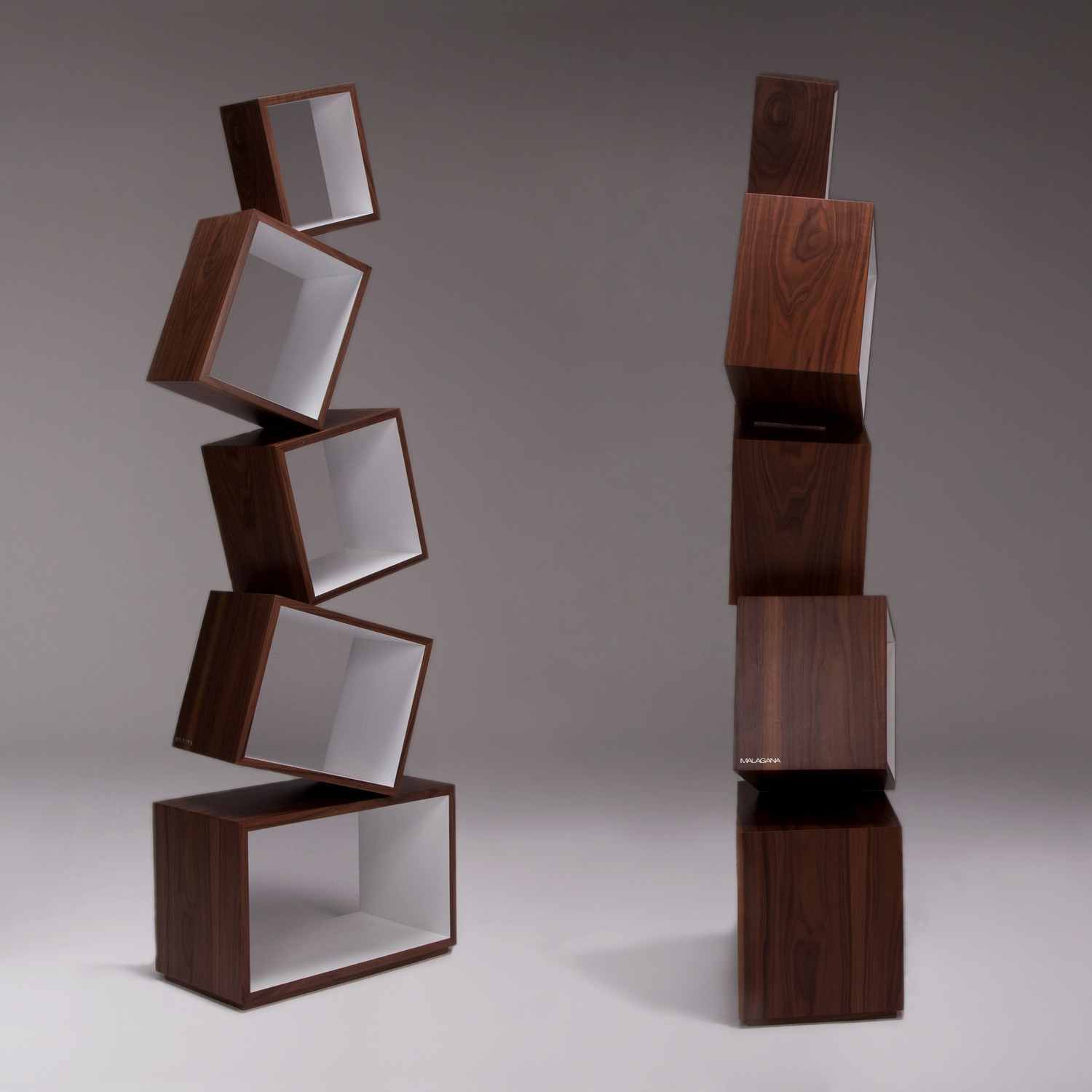 A clean white finish gives this walnut bookcase a sleek look that will blend in neatly within any space. Alejandro Gomez Stubbs, Malagana Design’s founder and Equilibrium’s architect, strives to create playful modern design. With its cantilevered modules stacked upon each other at a single angled point, Equilibrium is a unique furniture piece that immediately catches attention by creating a sense of amusement and surprise. While its compartments seem to float in the air, Equilibrium can hold up to 160 Lbs of weight and its different modules allow to keep books and magazines organized in a natural tilted position that eliminates the need for bookends.