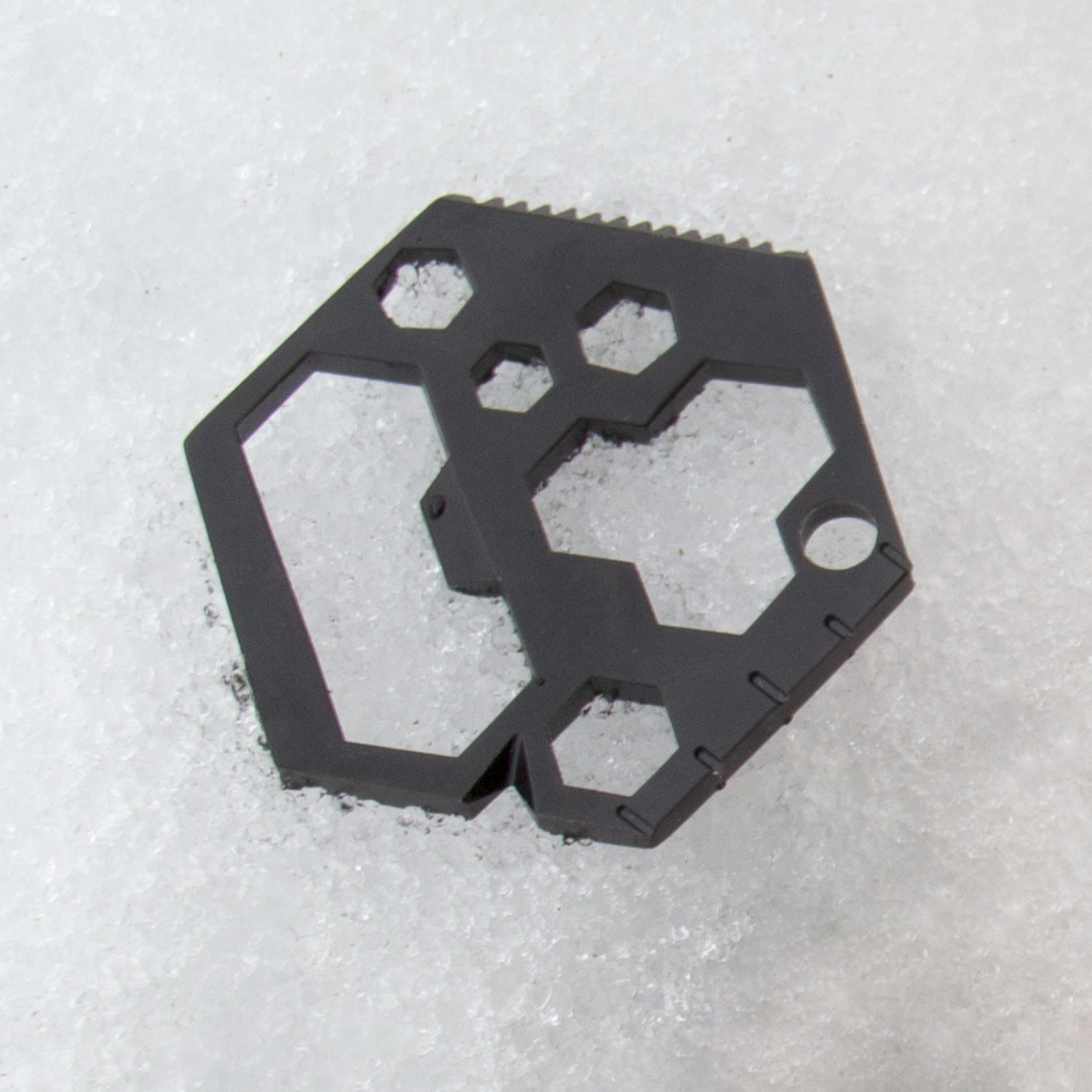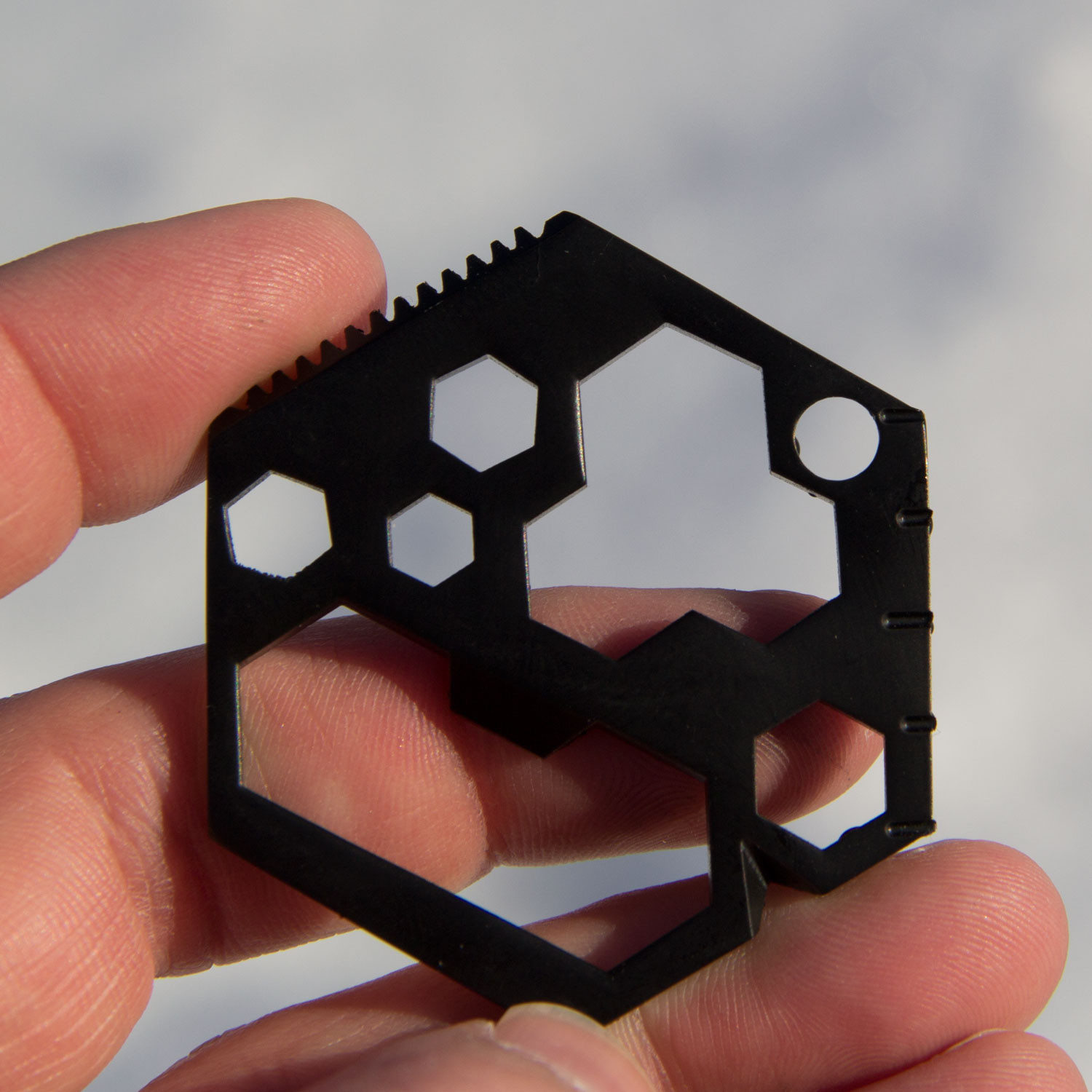 The Cricket is the mini companion to the Mantis, and you can almost hear it chirp with excitement at performing your tasks. The Cricket sports a hexagonal shape, with overall dimensions of 1.75” by 2”. Though compact, it features seven functionalities and an interesting design composition. Some of the uses include scraper, bottle cap opener, wire stripper, ruler and more.