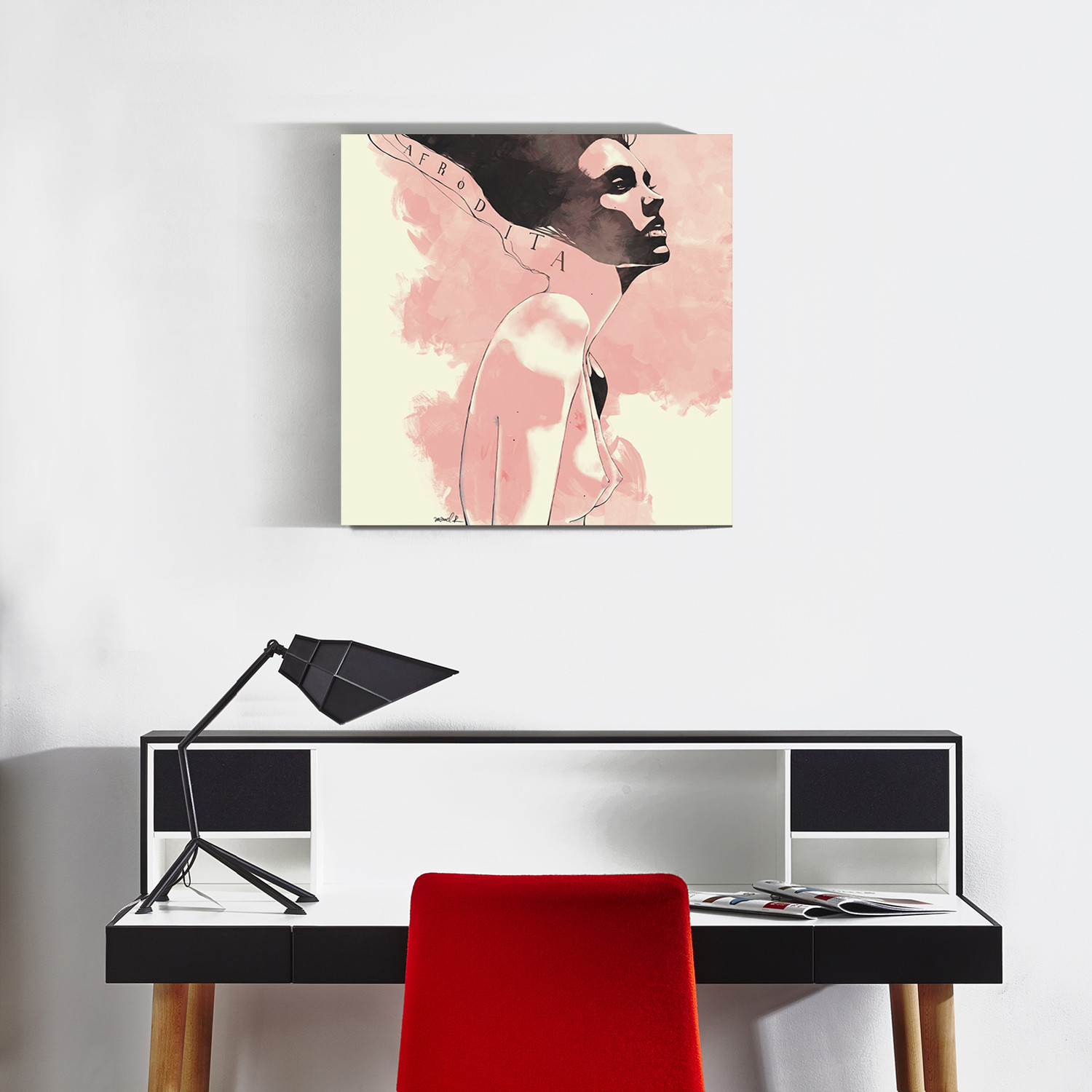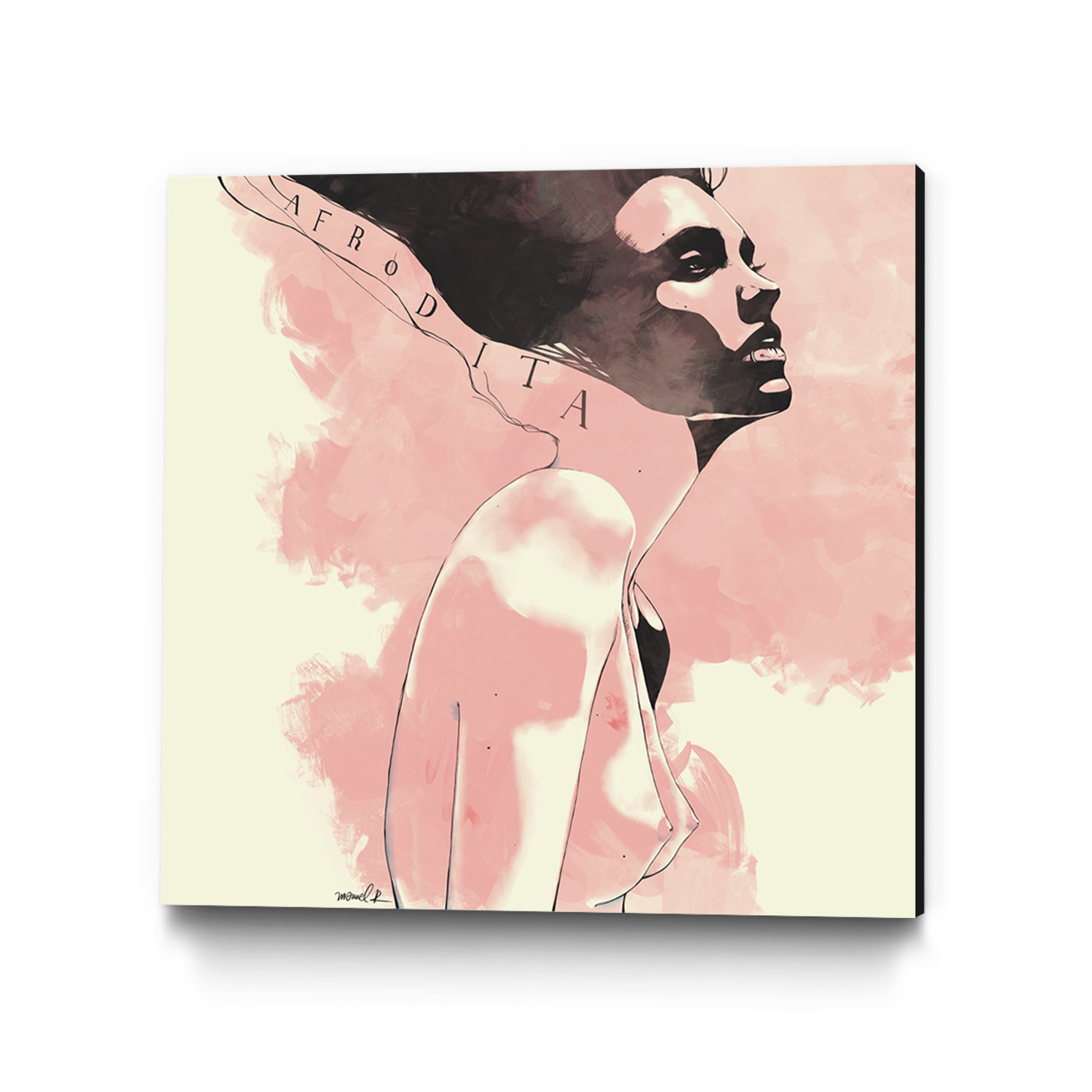 This high quality stretched canvas print has been created with a flattering black edge that complements the fashionable style of artist Manuel Rebollo. 'Afrodita' features a stylized raven-haired nude, subtly harking back to art nouveau prints of the early 20th century while still remaining thoroughly modern.