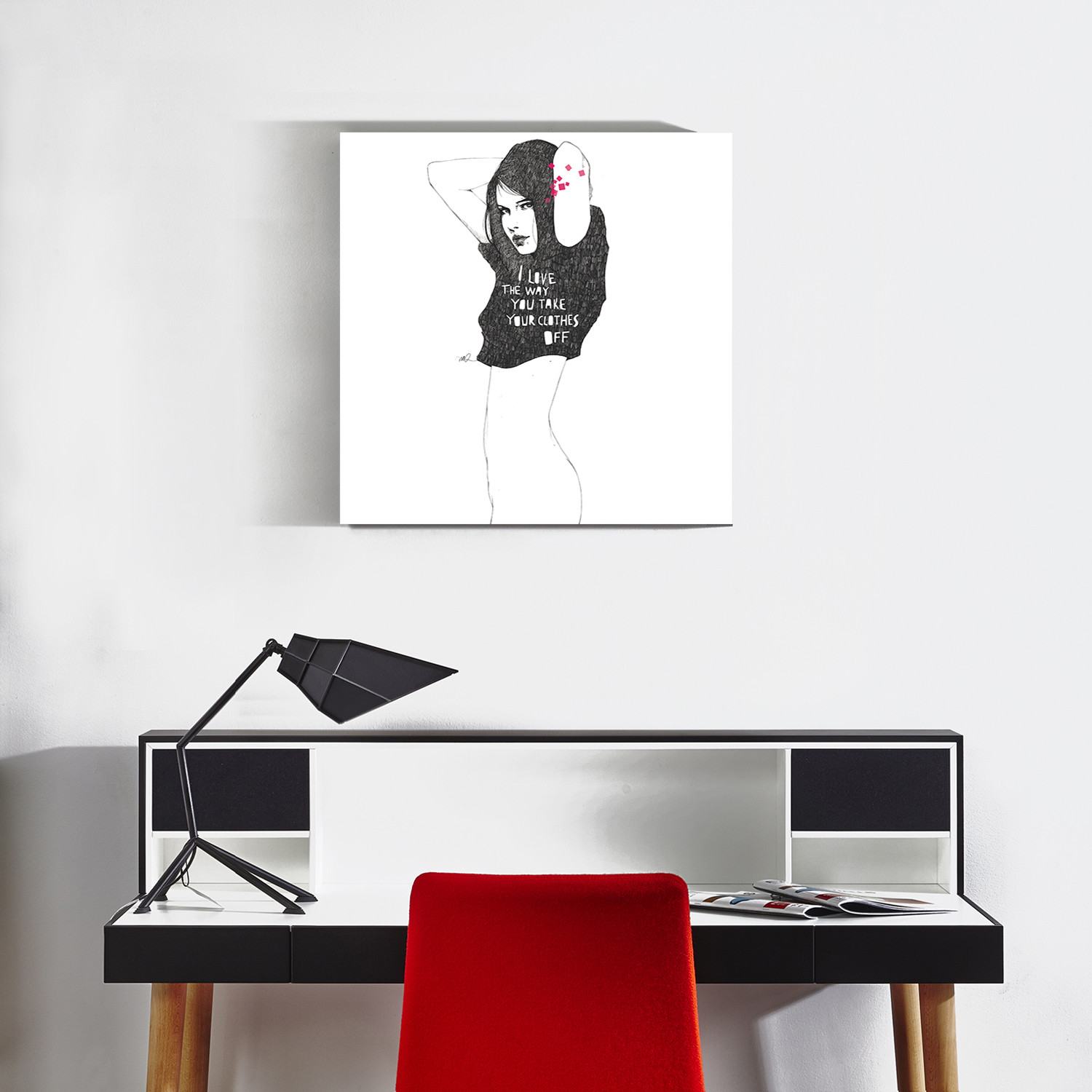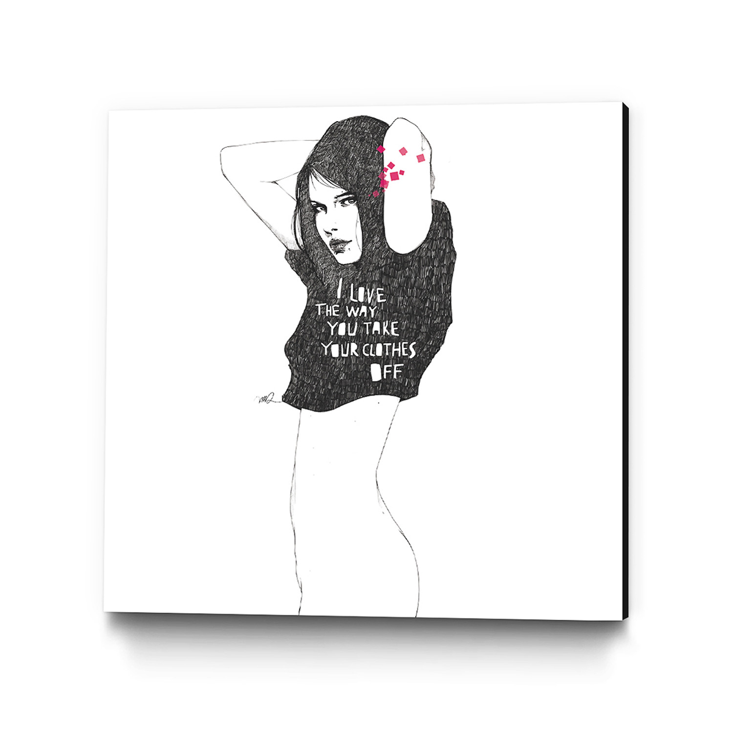 This high quality stretched canvas print has been created with a flattering black edge that complements the fashionable style of artist Manuel Rebollo. Using inky black lines and an eye-catching splash of bright pink, this print depicts a scantily-clad, modern day pin-up.