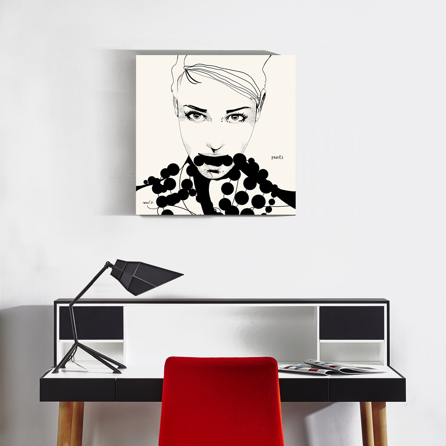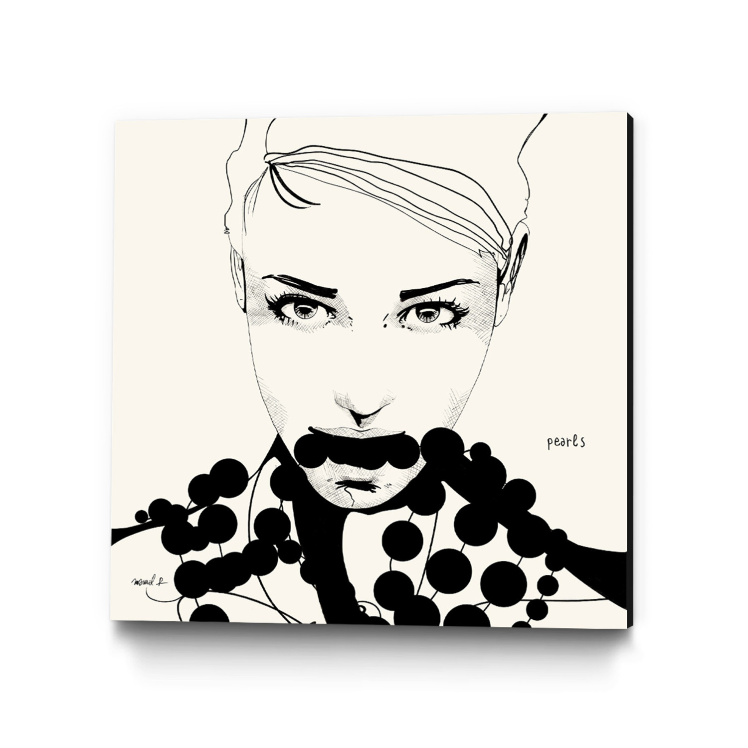 This high quality stretched canvas print has been created with a flattering black edge that complements the fashionable style of artist Manuel Rebollo. 'Pearls' features a beautiful modish girl who gazes knowingly at the viewer.