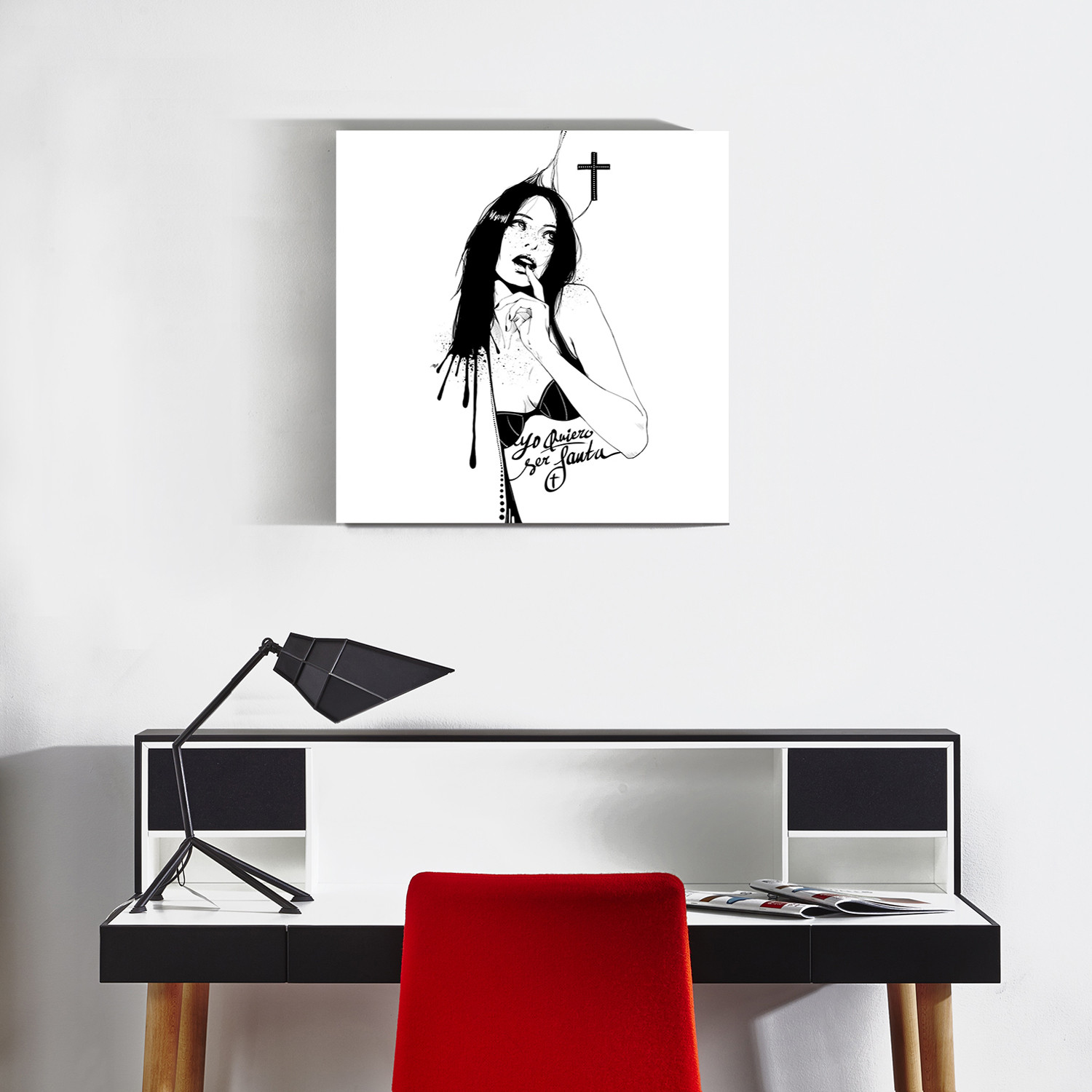 This high quality stretched canvas print has been created with a flattering black edge that complements the fashionable style of artist Manuel Rebollo. This inky black and white image depicts an angsty, snatily-clad raven-haired beauty, looking up at a suggestive black cross.