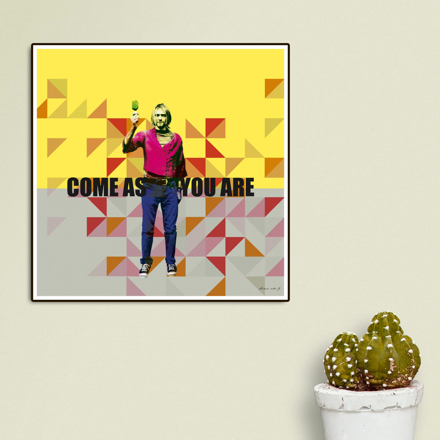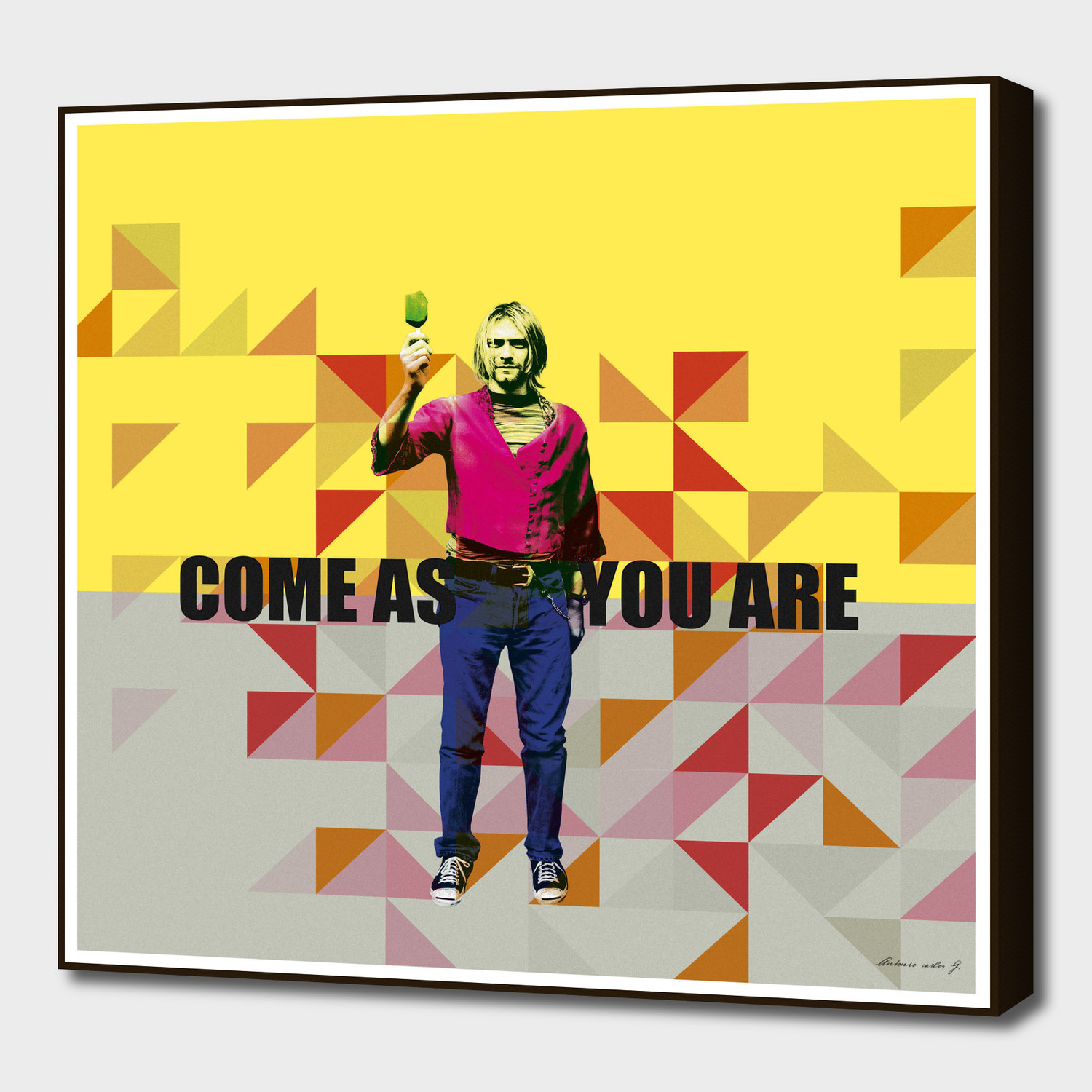 From a series by artist Marcus Guinoza depicting artists and their most-loved lyrics, this tongue in cheek take on fine art is available in the unique art block format. Kurt is numbered and signed, as well as being limited edition, and mounted to a masonite board so it pops out against a wall even without framing.