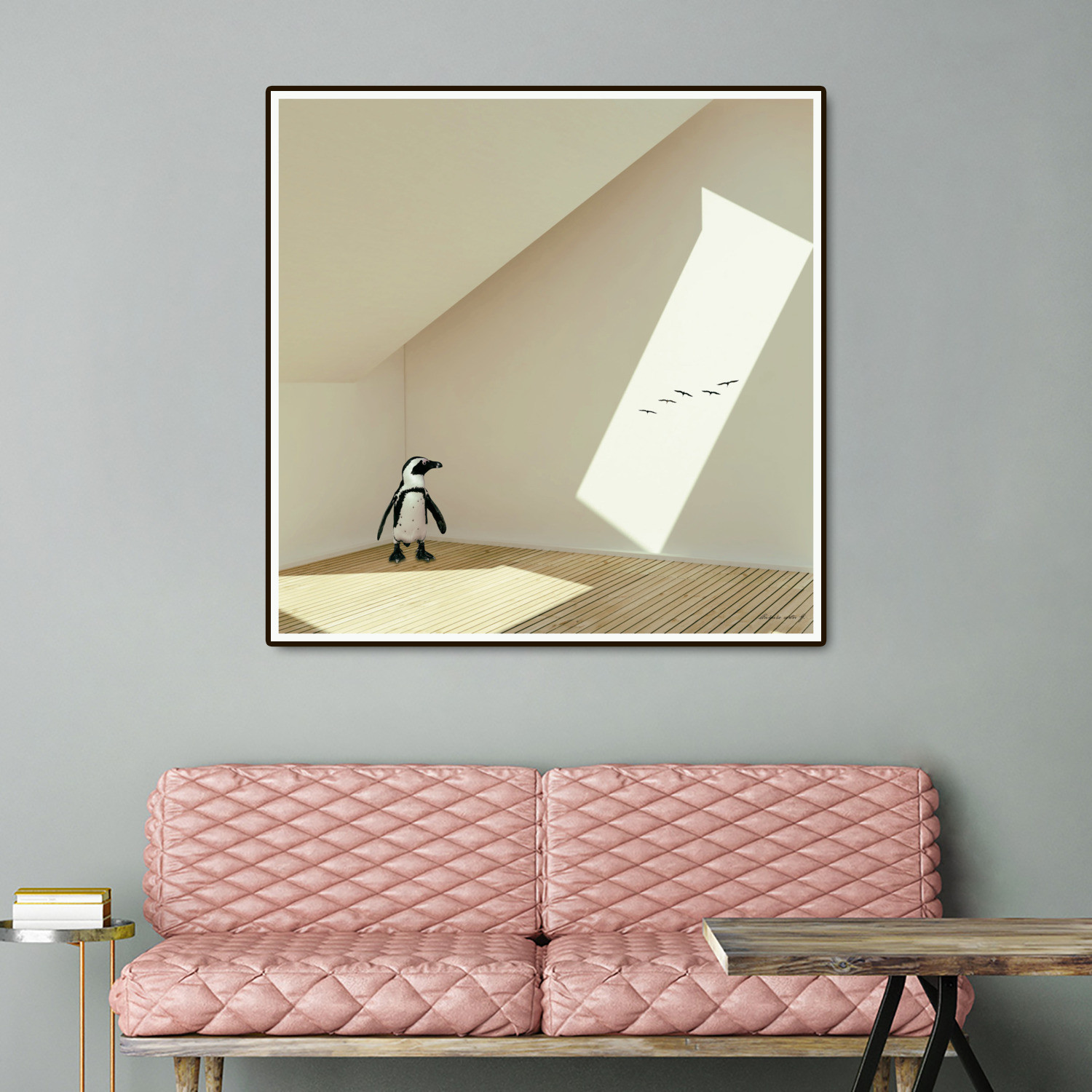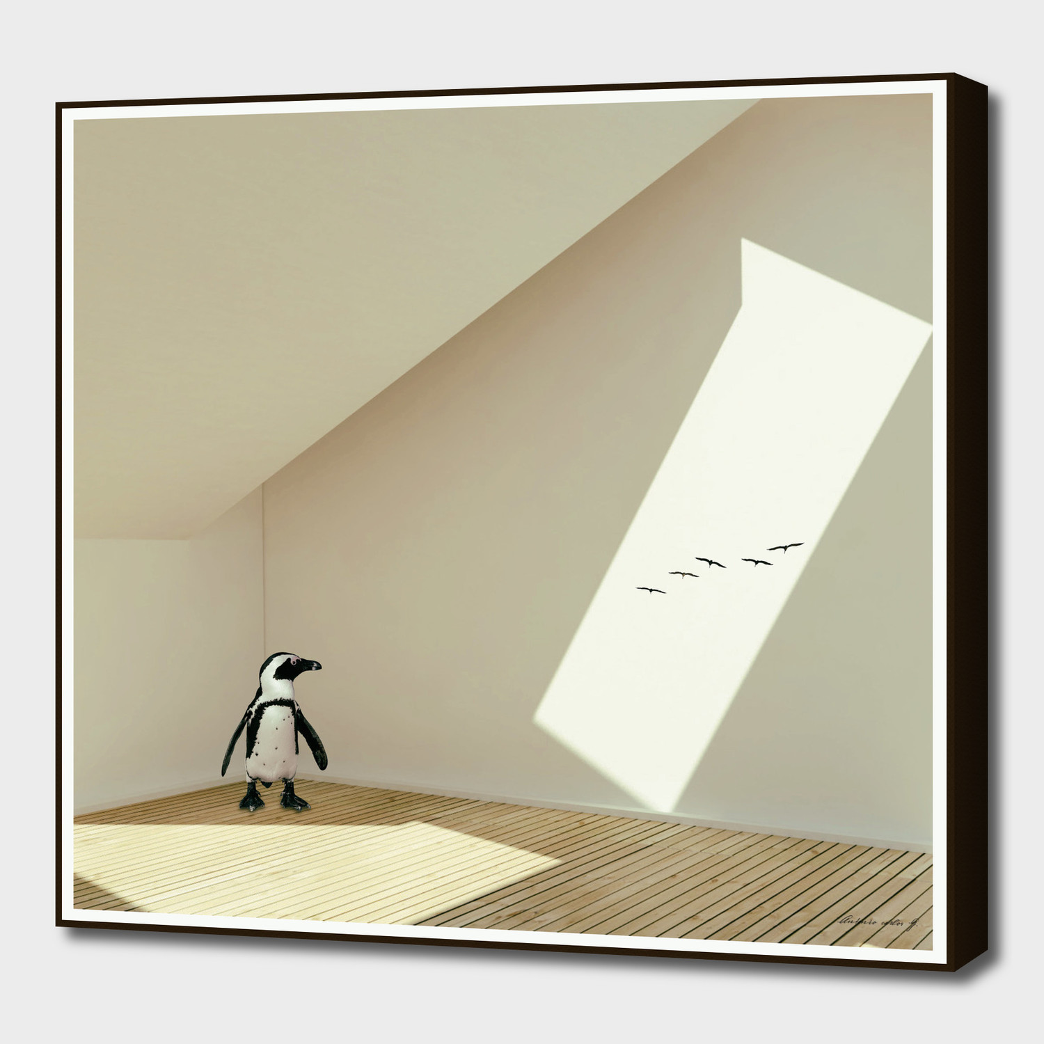 From a series by artist Marcus Guinoza depicting what happens when the wild comes inside, this tongue in cheek take on fine art is available in the unique art block format. The Last Penguin is numbered and signed, as well as being limited edition, and mounted to a masonite board so it pops out against a wall even without framing.