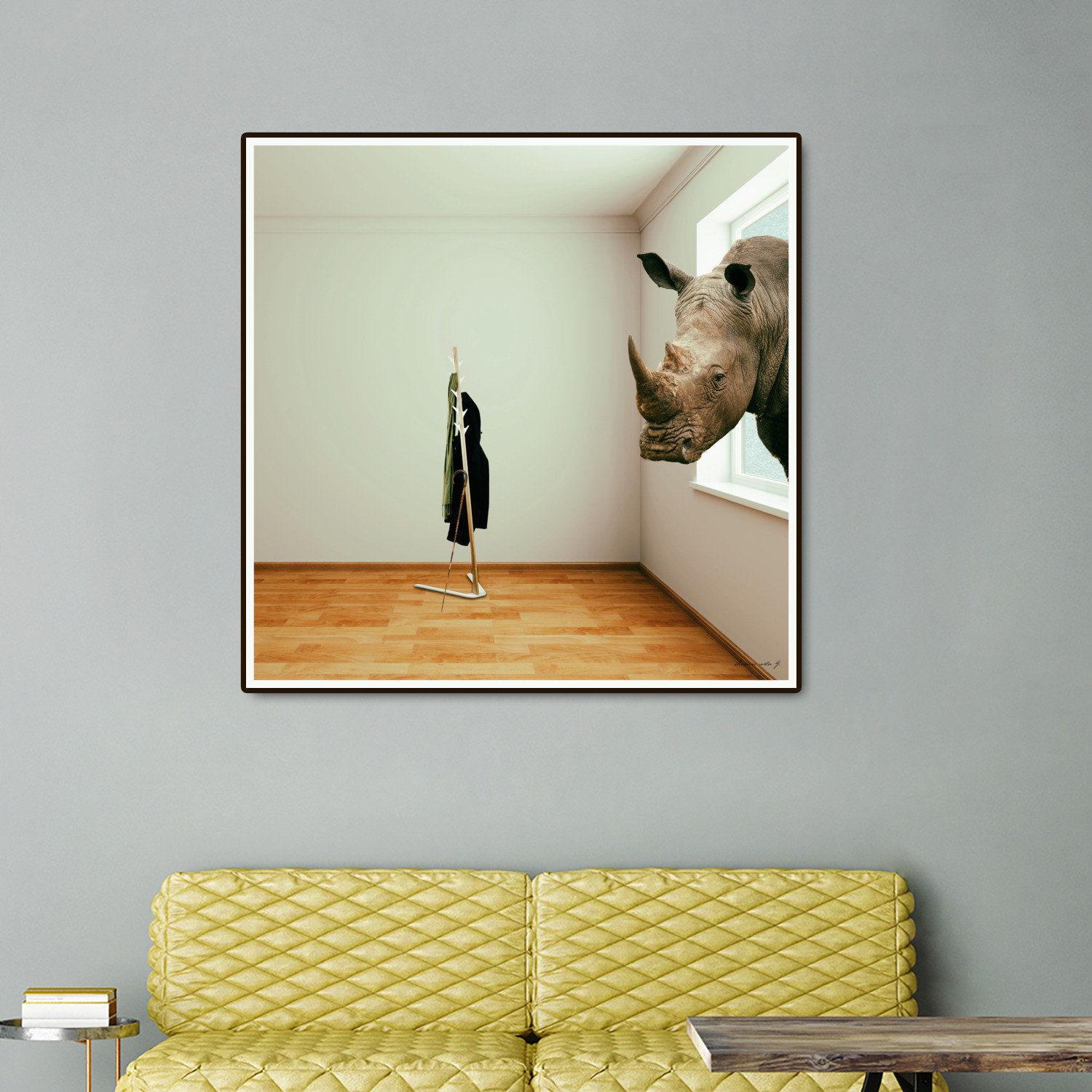 From a series by artist Marcus Guinoza depicting what happens when the wild comes inside, this tongue in cheek take on fine art is available in the unique art block format. The Last Rhino is numbered and signed, as well as being limited edition, and mounted to a masonite board so it pops out against a wall even without framing.