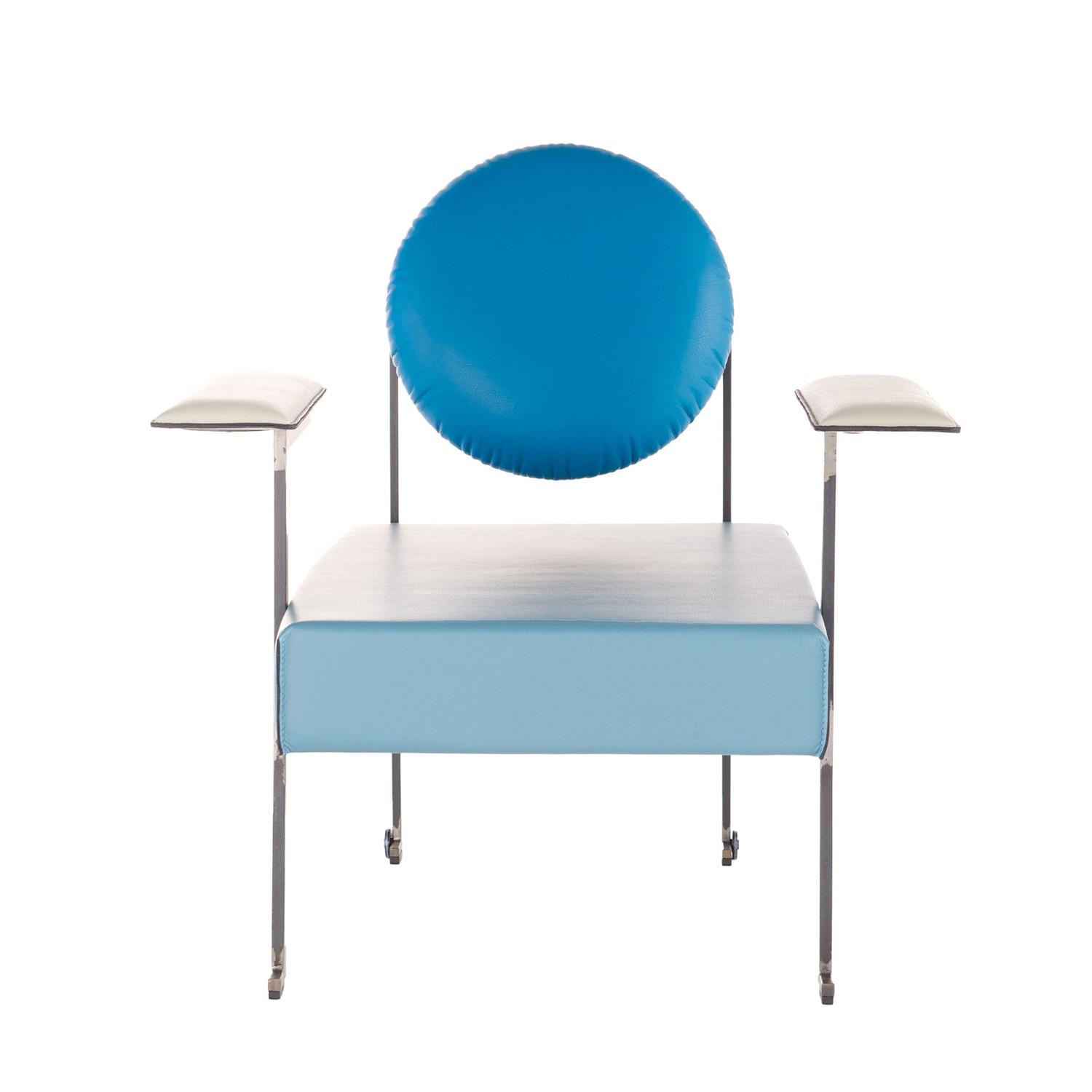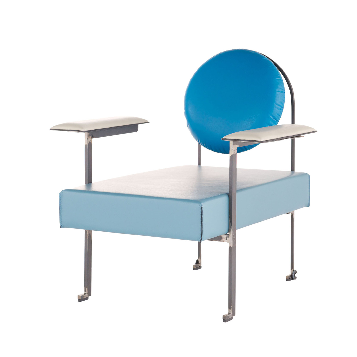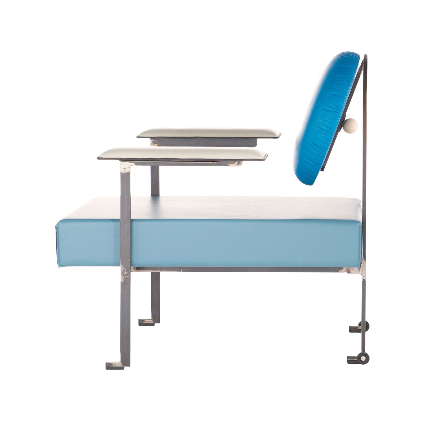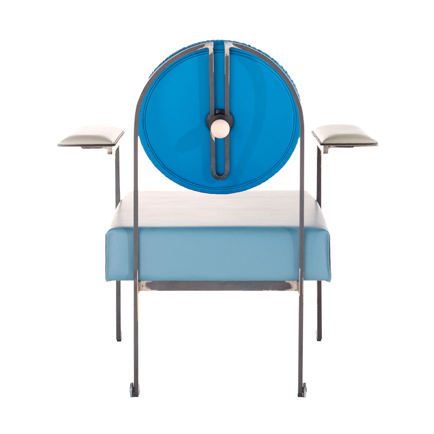 A gorgeously modular armchair made with welded iron, molded poly foam, and all-natural leather, the M will complete the look of any room with stylishly elegant ease. Contrasting color padding in a blue and white colorway makes it a prime choice for warm colors, slick steel, or exposed brick.