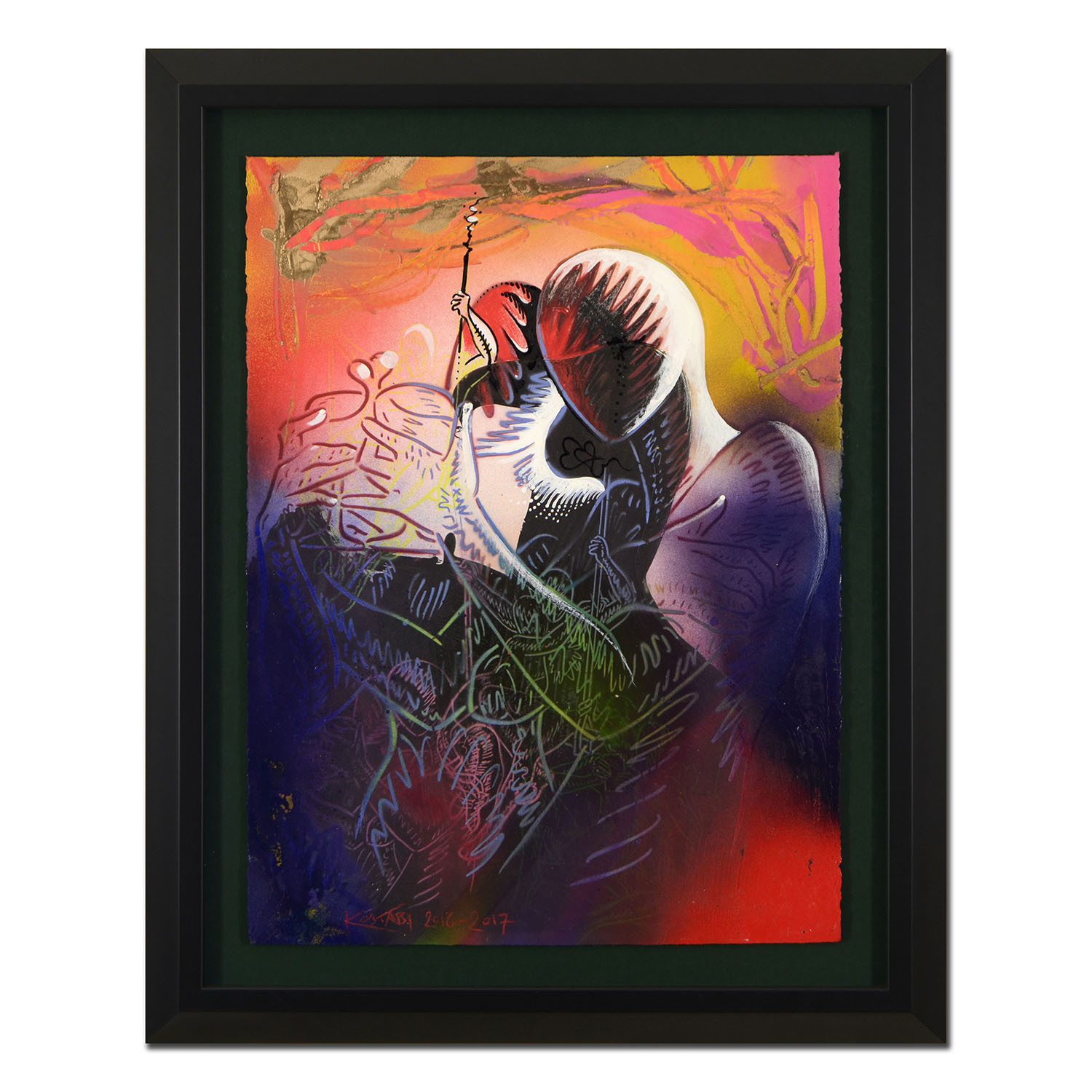 Mark Kostabi (1960-), is an American artist, sculptor, and composer, known for his abstract paintings of faceless figures, that are often meant as a comment on the social, political, and psychological state of the world. With a distinctive style influenced by other greats like Fernand Léger and Giorgio de Chirico, Kostabi has designed unusual and colorful pieces for a vast array of purposes, including album covers for Guns N' Roses, The Ramones, Seether, and more. And that nostalgic, edgy artistry can be yours forever, with this incredible original work, autographed by the man himself - the only one of it's kind to ever exist.