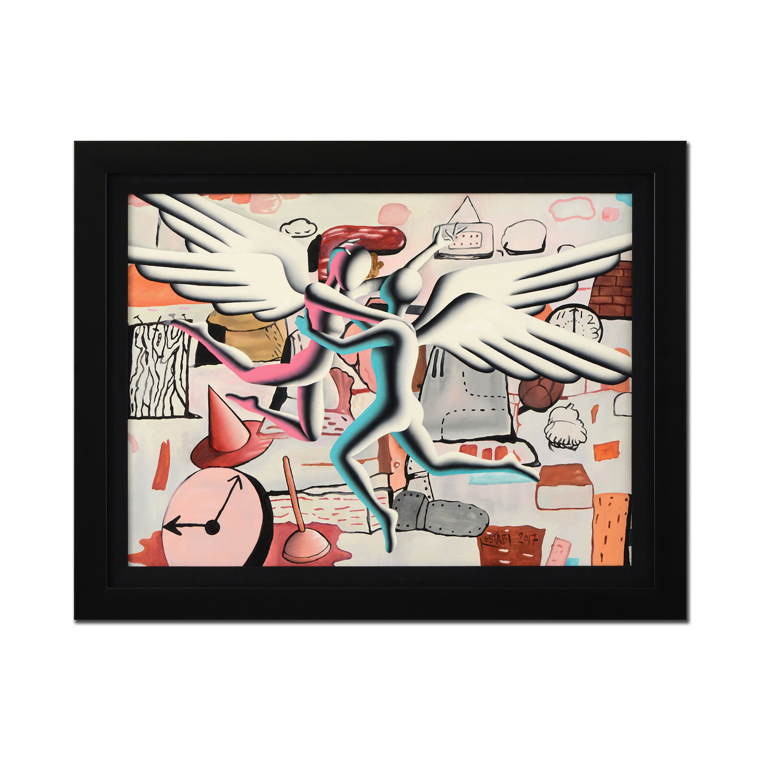 Mark Kostabi (1960-), is an American artist, sculptor, and composer, known for his abstract paintings of faceless figures, that are often meant as a comment on the social, political, and psychological state of the world. With a distinctive style influenced by other greats like Fernand Léger and Giorgio de Chirico, Kostabi has designed unusual and colorful pieces for a vast array of purposes, including album covers for Guns N' Roses, The Ramones, Seether, and more. And that nostalgic, edgy artistry can be yours forever, with this incredible original work, autographed by the man himself - the only one of it's kind to ever exist.