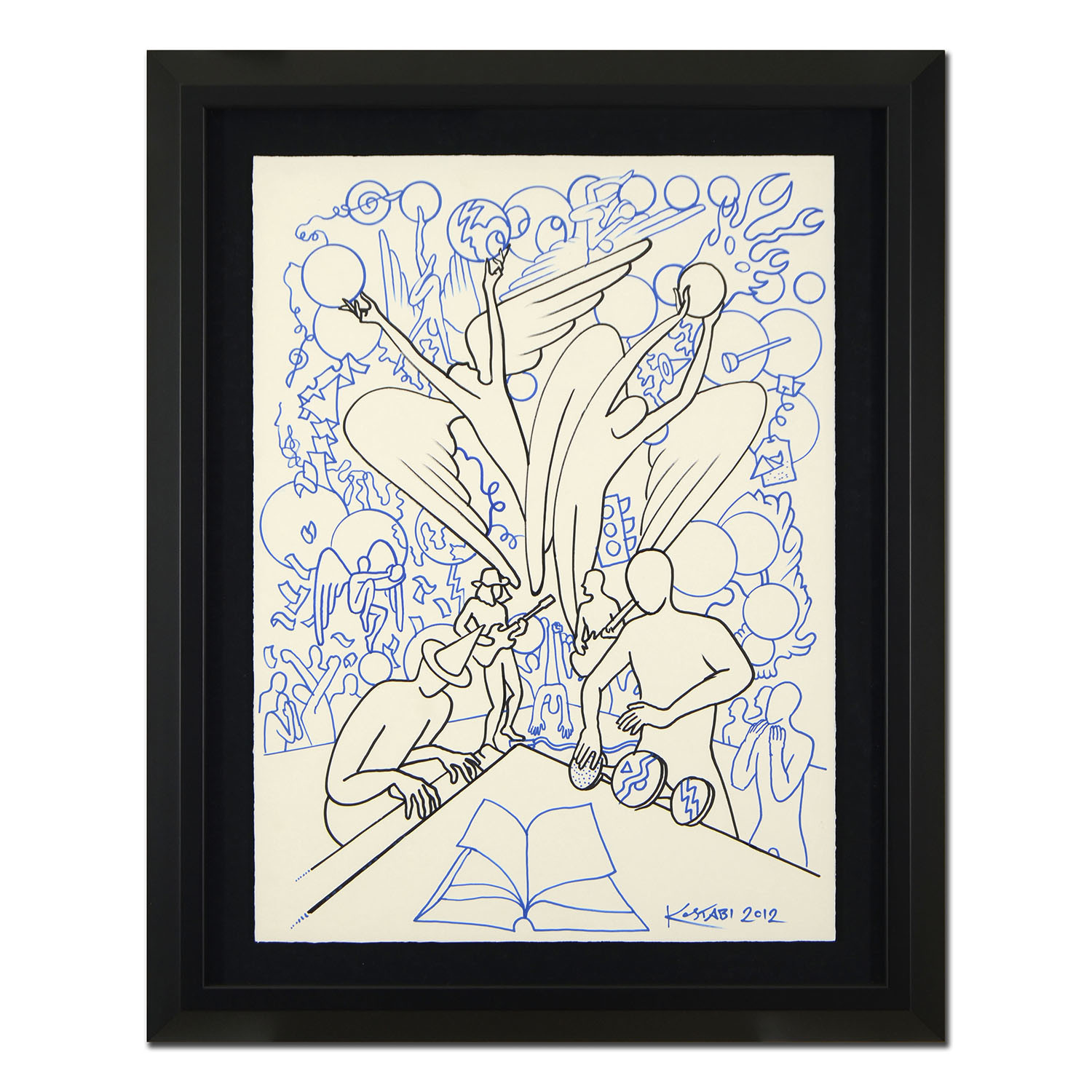 Mark Kostabi (1960-), is an American artist, sculptor, and composer, known for his abstract paintings of faceless figures, that are often meant as a comment on the social, political, and psychological state of the world. With a distinctive style influenced by other greats like Fernand Léger and Giorgio de Chirico, Kostabi has designed unusual and colorful pieces for a vast array of purposes, including album covers for Guns N' Roses, The Ramones, Seether, and more. And that nostalgic, edgy artistry can be yours forever, with this incredible original work, autographed by the man himself - the only one of it's kind to ever exist.