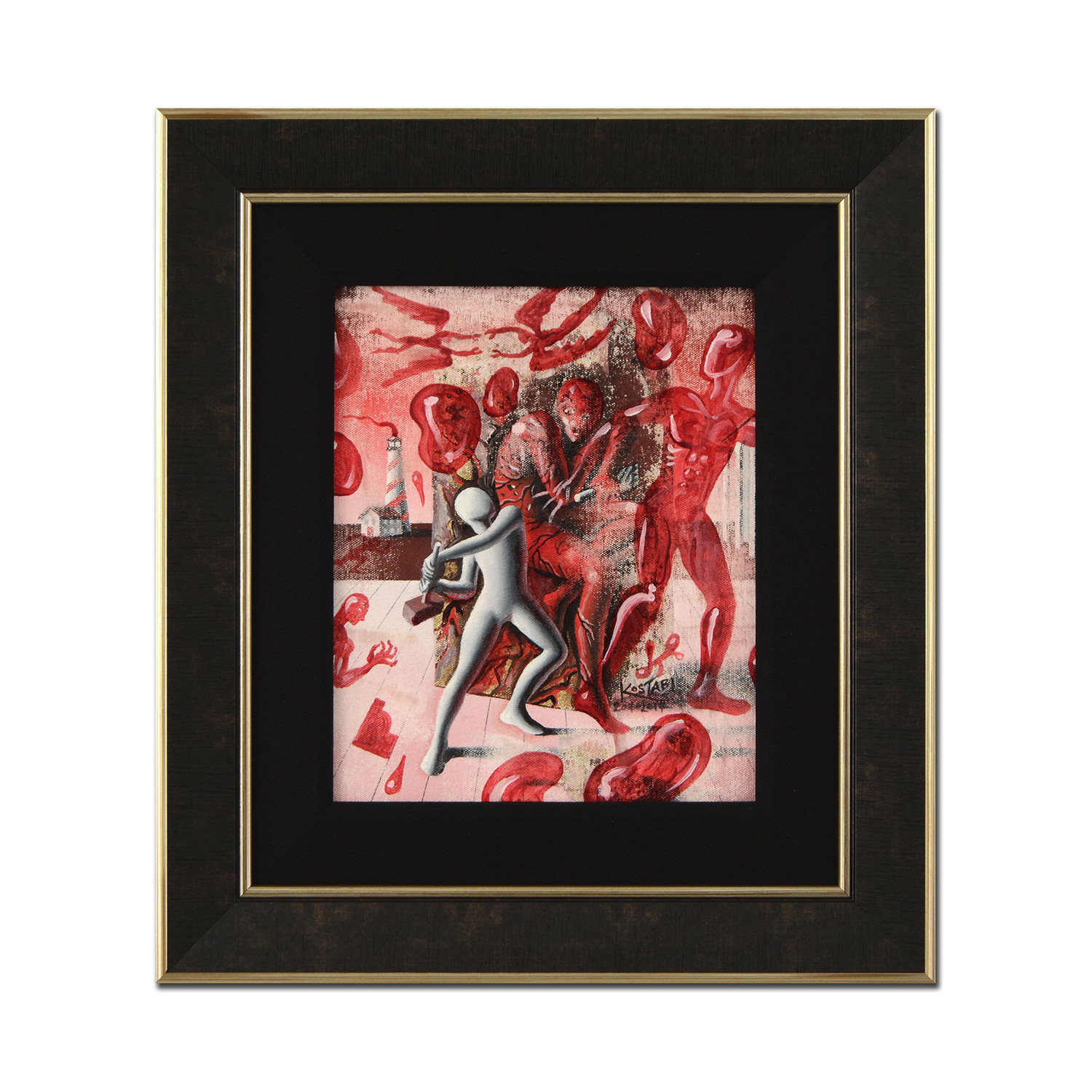 Mark Kostabi (1960-), is an American artist, sculptor, and composer, known for his abstract paintings of faceless figures, that are often meant as a comment on the social, political, and psychological state of the world. With a distinctive style influenced by other greats like Fernand Léger and Giorgio de Chirico, Kostabi has designed unusual and colorful pieces for a vast array of purposes, including album covers for Guns N' Roses, The Ramones, Seether, and more. And that nostalgic, edgy artistry can be yours forever, with this incredible original work, autographed by the man himself - the only one of it's kind to ever exist.