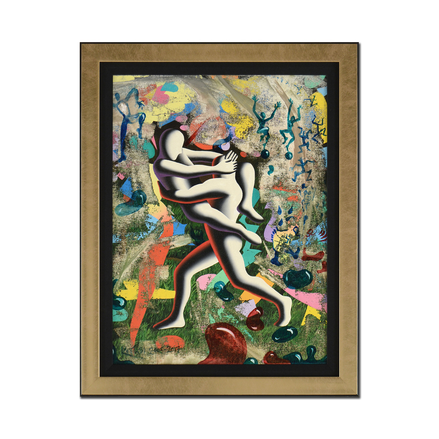 Mark Kostabi (1960-), is an American artist, sculptor, and composer, known for his abstract paintings of faceless figures, that are often meant as a comment on the social, political, and psychological state of the world. With a distinctive style influenced by other greats like Fernand Léger and Giorgio de Chirico, Kostabi has designed unusual and colorful pieces for a vast array of purposes, including album covers for Guns N' Roses, The Ramones, Seether, and more. And that nostalgic, edgy artistry can be yours forever, with this incredible original work, autographed by the man himself - the only one of it's kind to ever exist.