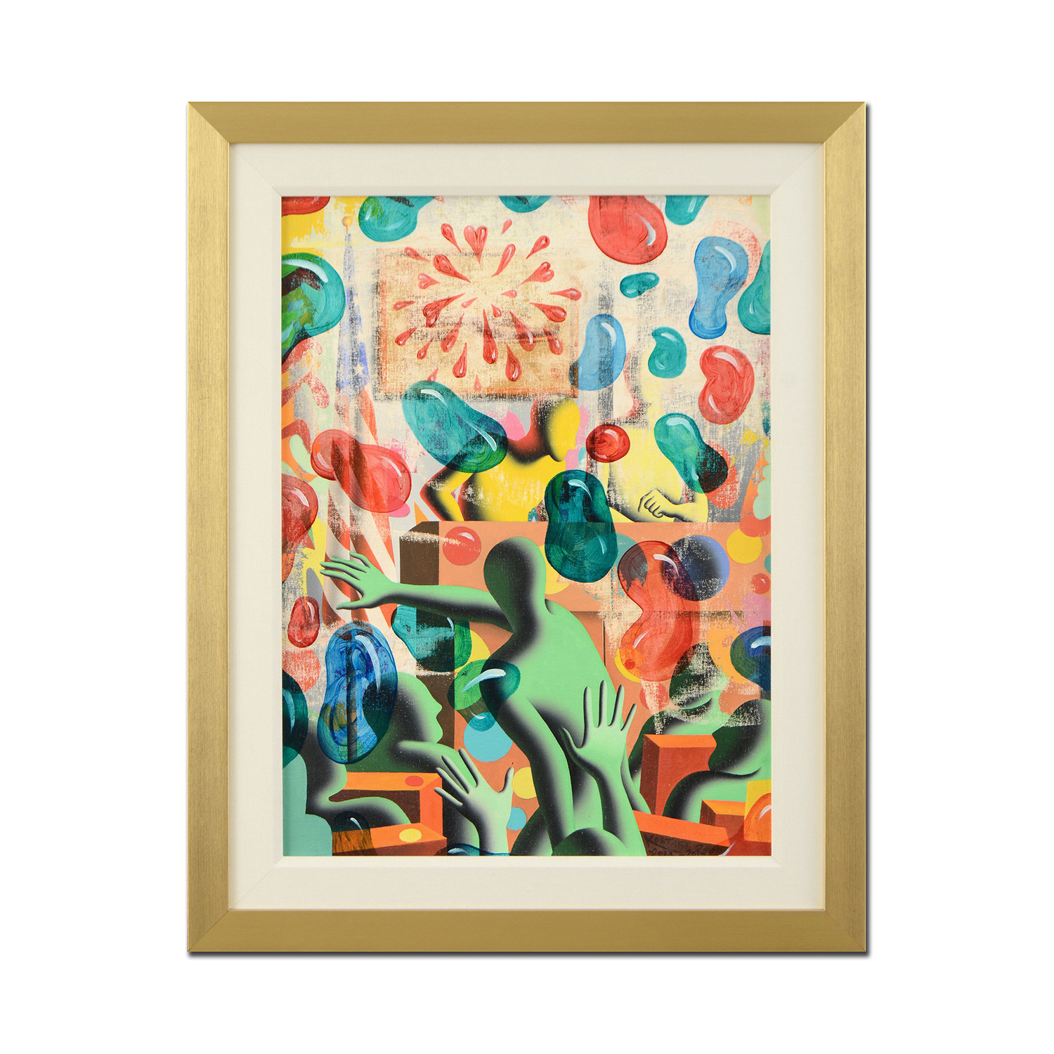 Mark Kostabi (1960-), is an American artist, sculptor, and composer, known for his abstract paintings of faceless figures, that are often meant as a comment on the social, political, and psychological state of the world. With a distinctive style influenced by other greats like Fernand Léger and Giorgio de Chirico, Kostabi has designed unusual and colorful pieces for a vast array of purposes, including album covers for Guns N' Roses, The Ramones, Seether, and more. And that nostalgic, edgy artistry can be yours forever, with this incredible original work, autographed by the man himself - the only one of it's kind to ever exist.