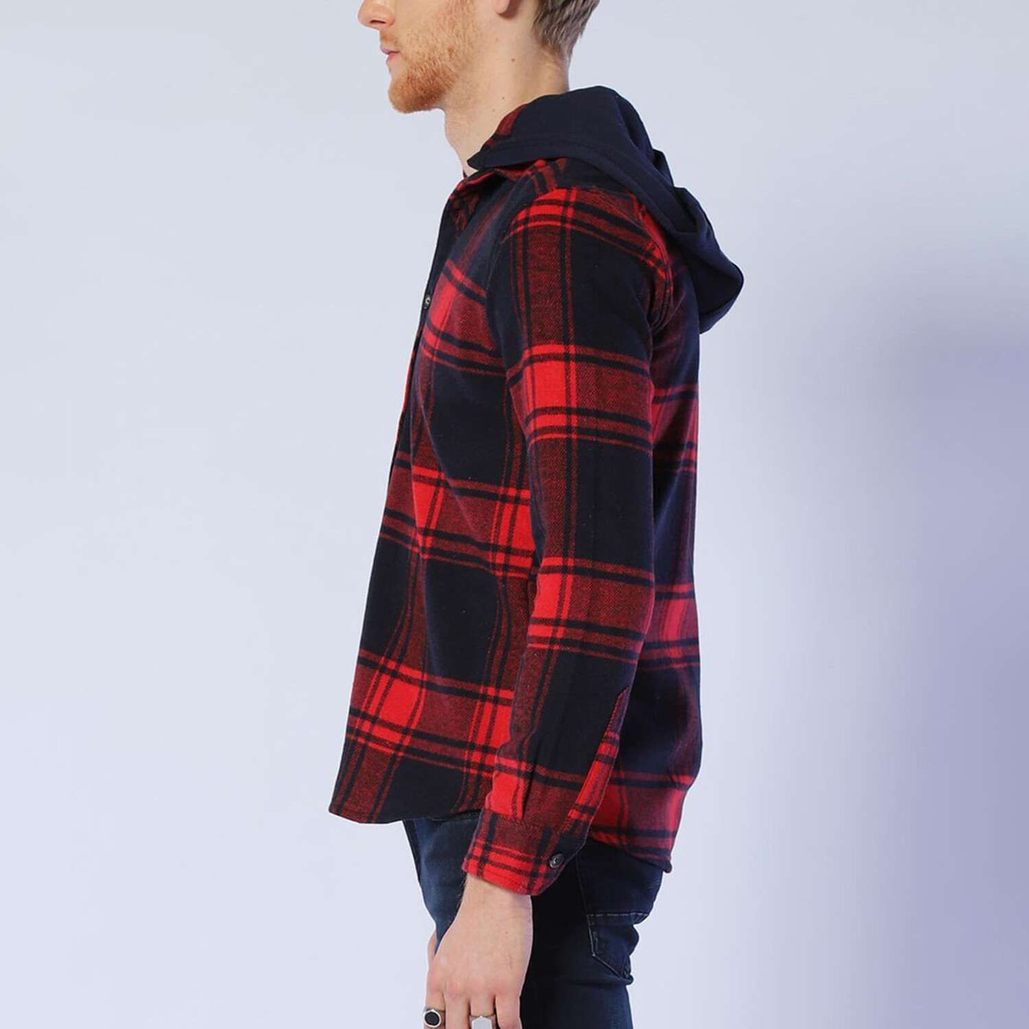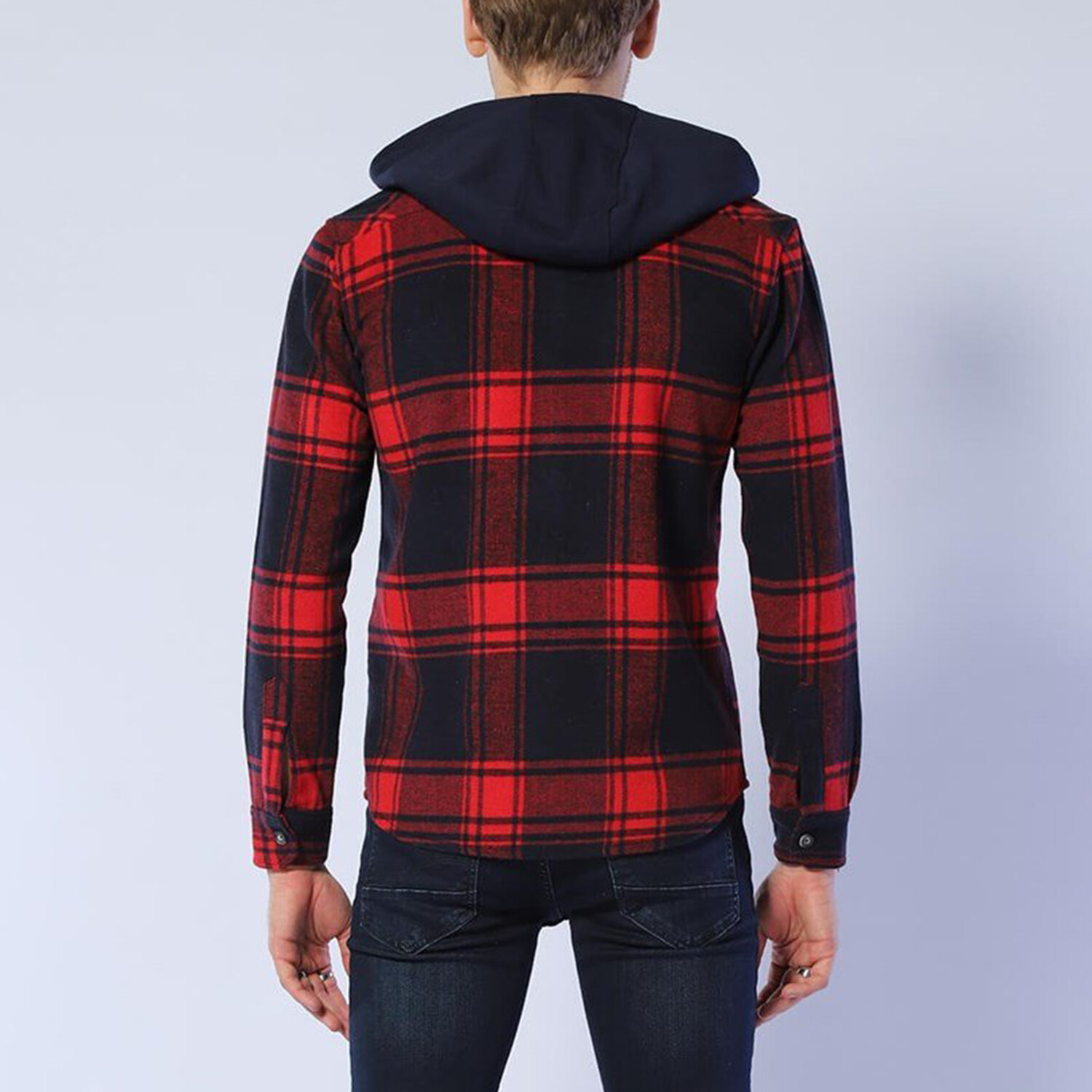 Hooded Plaid Jacket // Navy Blue + Red