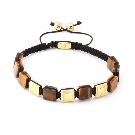 As a member of the quartz family, tiger eye gemstones provide a semi-precious item, and when combined with 14K gold plated squares, produces a hip-hop infused product. Each of the 14K gold plated squares also comes with the Greek key design to provide a decorative border to make the squares standout next to each of the polished stones. And when held together by a high-synthetic rope, this 14K Gold Greek Key + Tiger-Eye bracelet provides a durable product for active lifestyles.