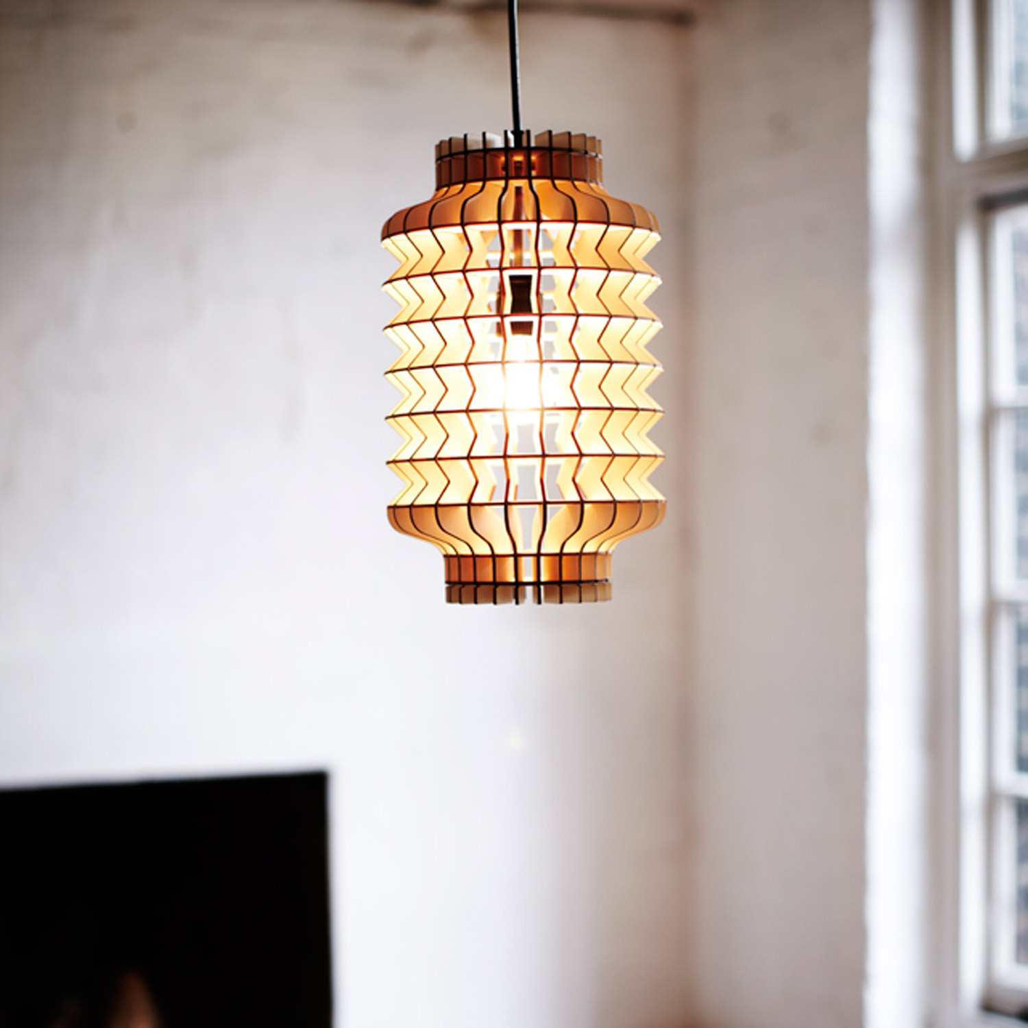 The Lantern has a classic, Japanese silhouette and adds warmth to your space wth its ambient glow. This piece is totally symmetrical with beautiful juxtaposition of light and dark wood and an industrial bulb.