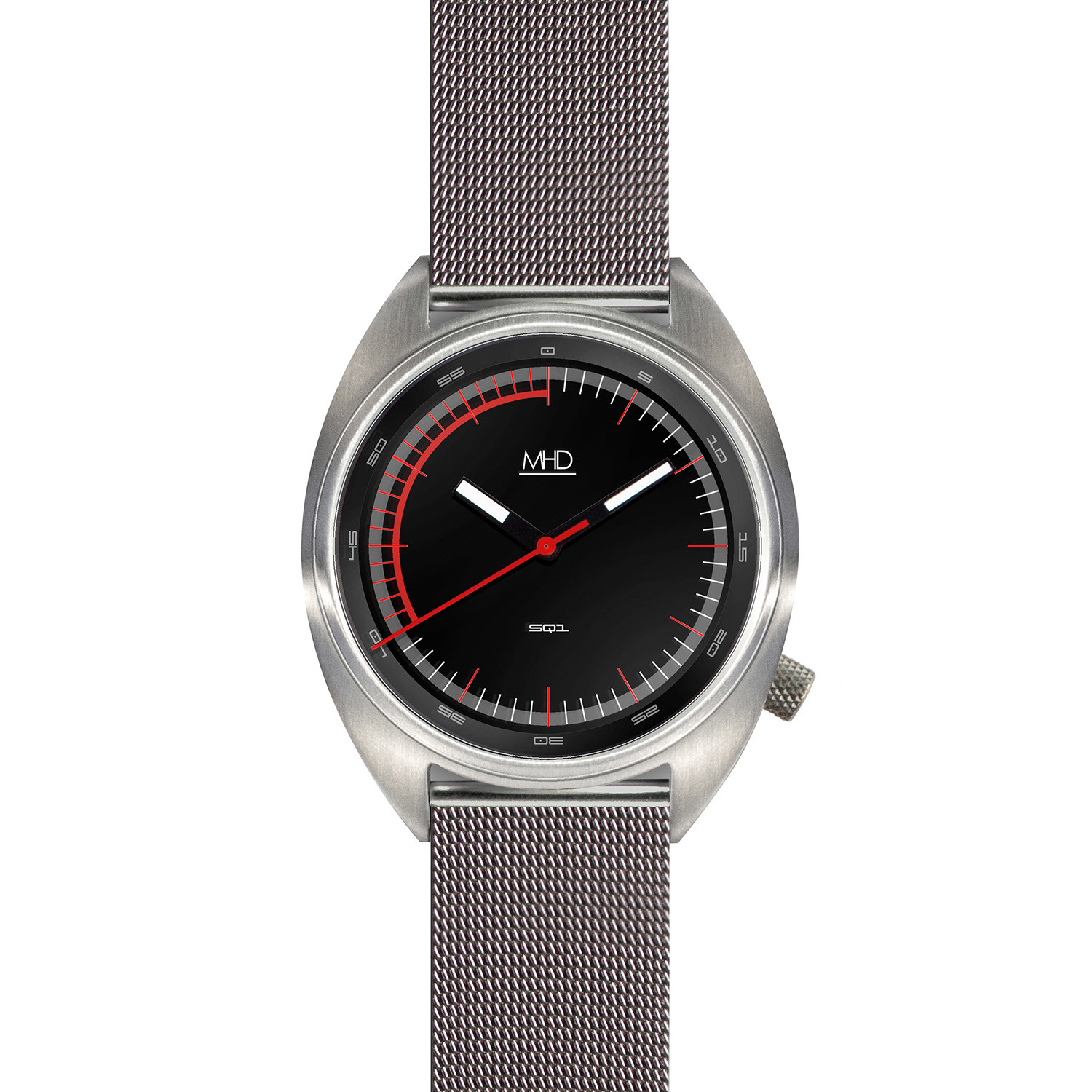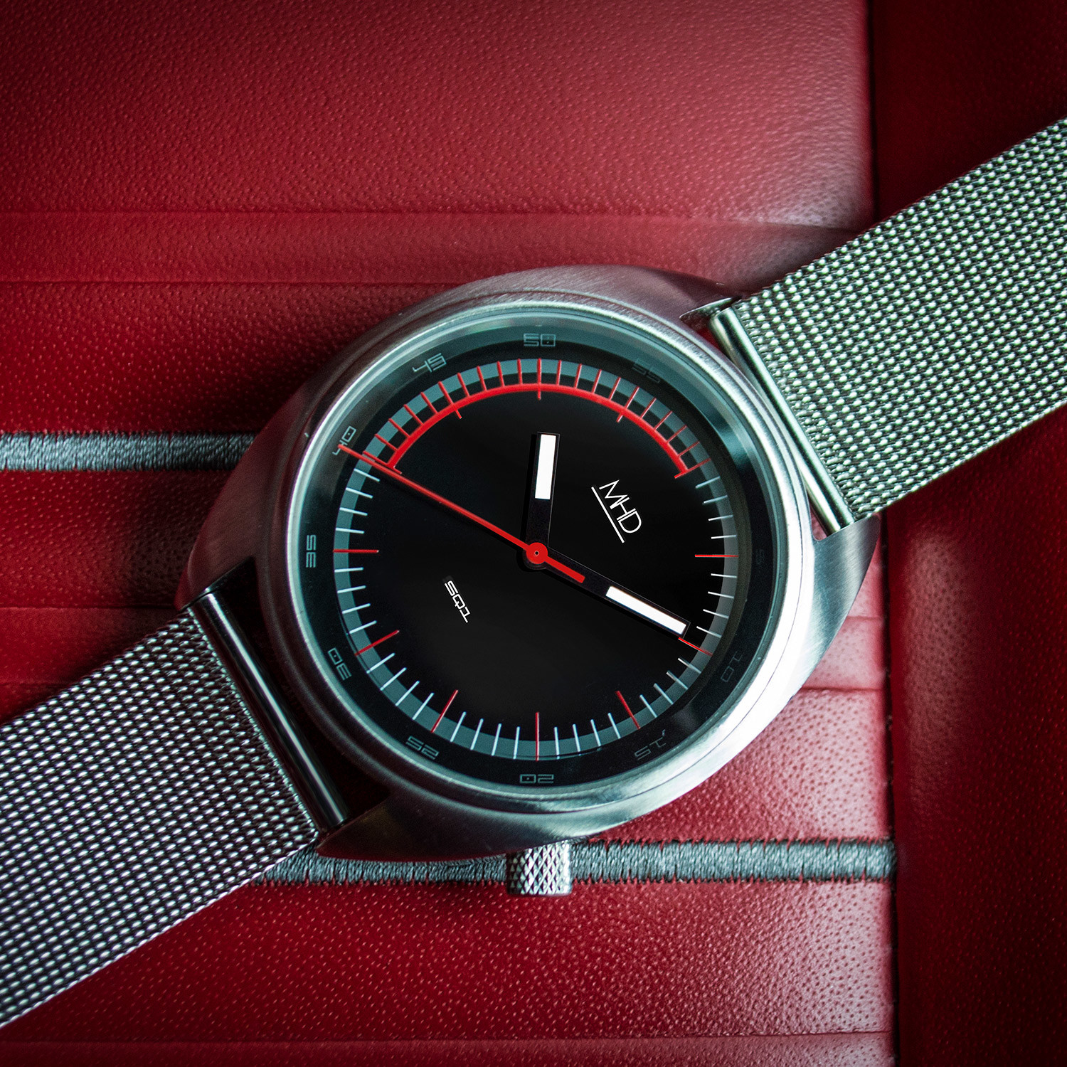 The Matthew Humphries Motorsports Quartz captures the style and case shape of 60’s and 70’s watches, whilst the dial takes influence from the cars of the same period, in particular the “red zone” of the rev counters made famous by classic Porsche 911 VDO car dials. Humphries always admired the period for its experimentation, especially in motoring watches, and has tried to capture this within the MHDSQ1 through: from the bold manufactured look of the stainless steel watch case shape, to the functional screw down crown with knurled edge finish, to the brightly colored dial, pairied with an iconic leather rally strap that is reminiscent of the time.