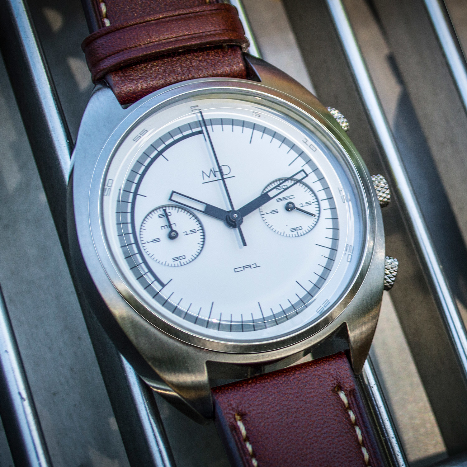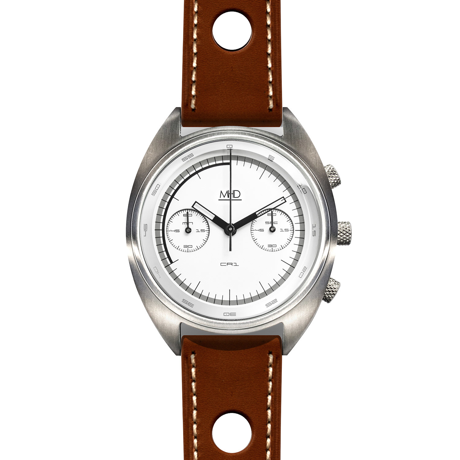 The MHDCR1 captures the style of 60‘s/70’s motoring watches, with its bold industrial stainless steel case, screw down knurled edge crown, and infamous leather rally strap adorned by many a race driver. Drawing on Humphries’ car design background and style, this timepiece is tied to the automotive industry through its gauge-inspired design. The Racing Chronograph shifts into a modern, functional watch, with, cut-out minute and hour hands for constant visibility of the sub dials, and an unusual extra long second hand, which allows the rally enthusiast to easily count every second.