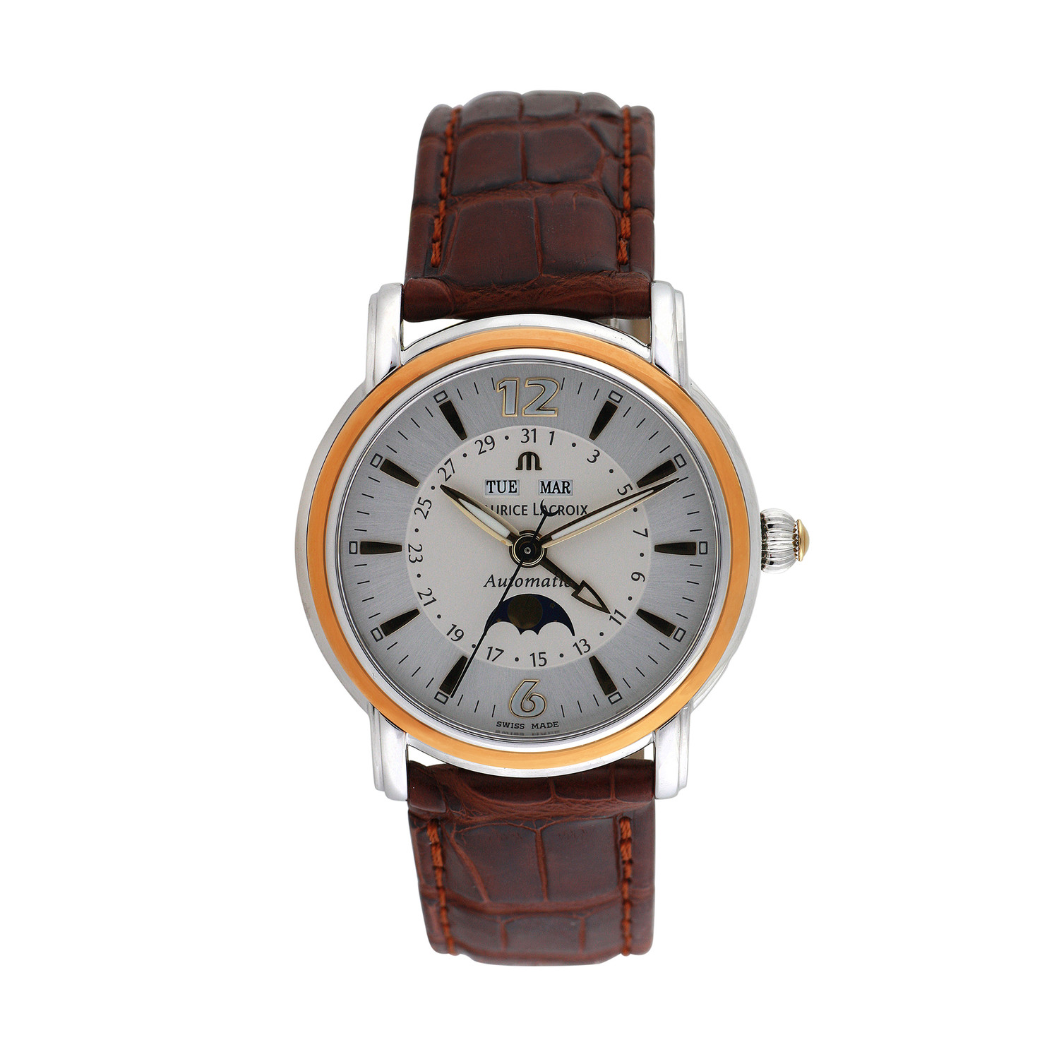 The timepieces in the Masterpiece Collection are the perfect synthesis of Maurice Lacroix know-how and are anchored in an urban, dynamic and elegant 21st century. This collection spearheads the brand, and, its interpretation is a wonderful illustration of what Maurice Lacroix has been specializing in for many years — with this one combining stainless steel, 18K gold, and brown leather to beautiful effect.