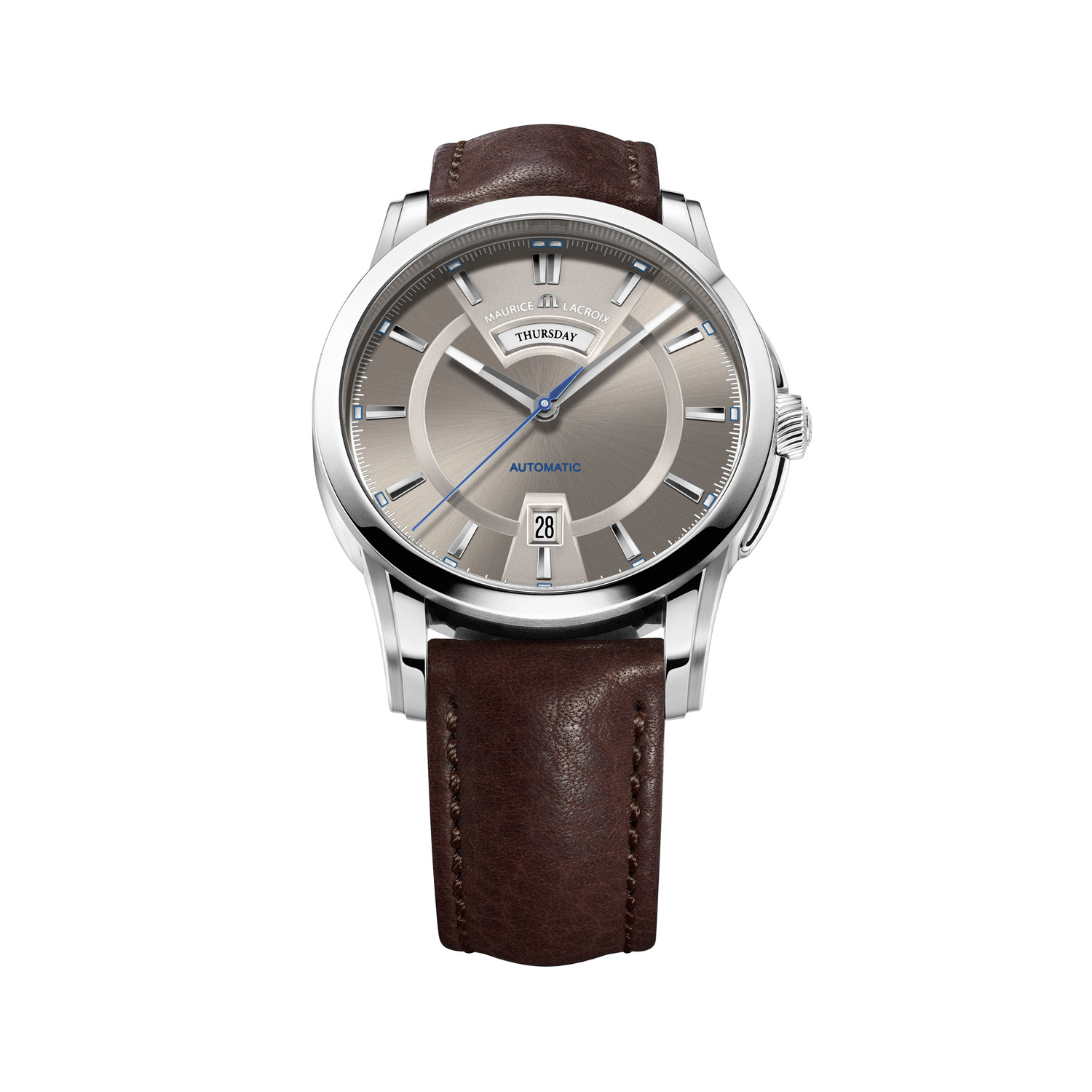 The best-selling watch in the Pontos Collection, the emblematic profile of the Day/Date model has a deep, radiant finish which emphasizes its functions, underlines its timeless elegance and confirms its distinguished character. Under the sapphire crystal with anti-reflective coating on both sides, the demeanor is stately. A date aperture maintains a very discreet presence at 6 o'clock. The day of the week is displayed at the other side of the dial in an arching semi-circle.
