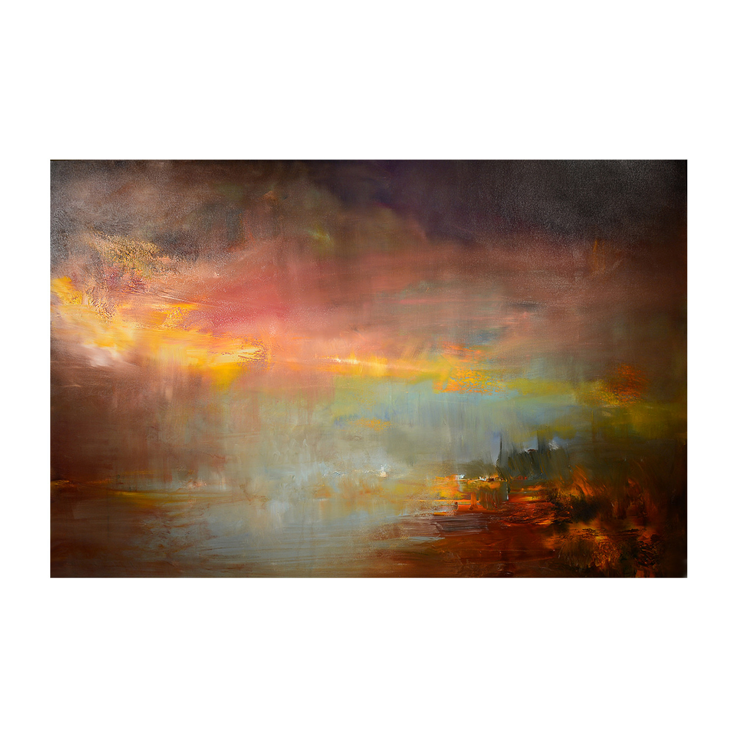 Port of Call is one of his more abstract landscapes with no straightforward land, water, or sky relationships. In an array of colors this oil painting captures the essence of a late evening walk near the bay, where the sun is filling the clouds with bursts of pink and yellow which reflect of the water and blend with the rich earth colors of the shoreline.