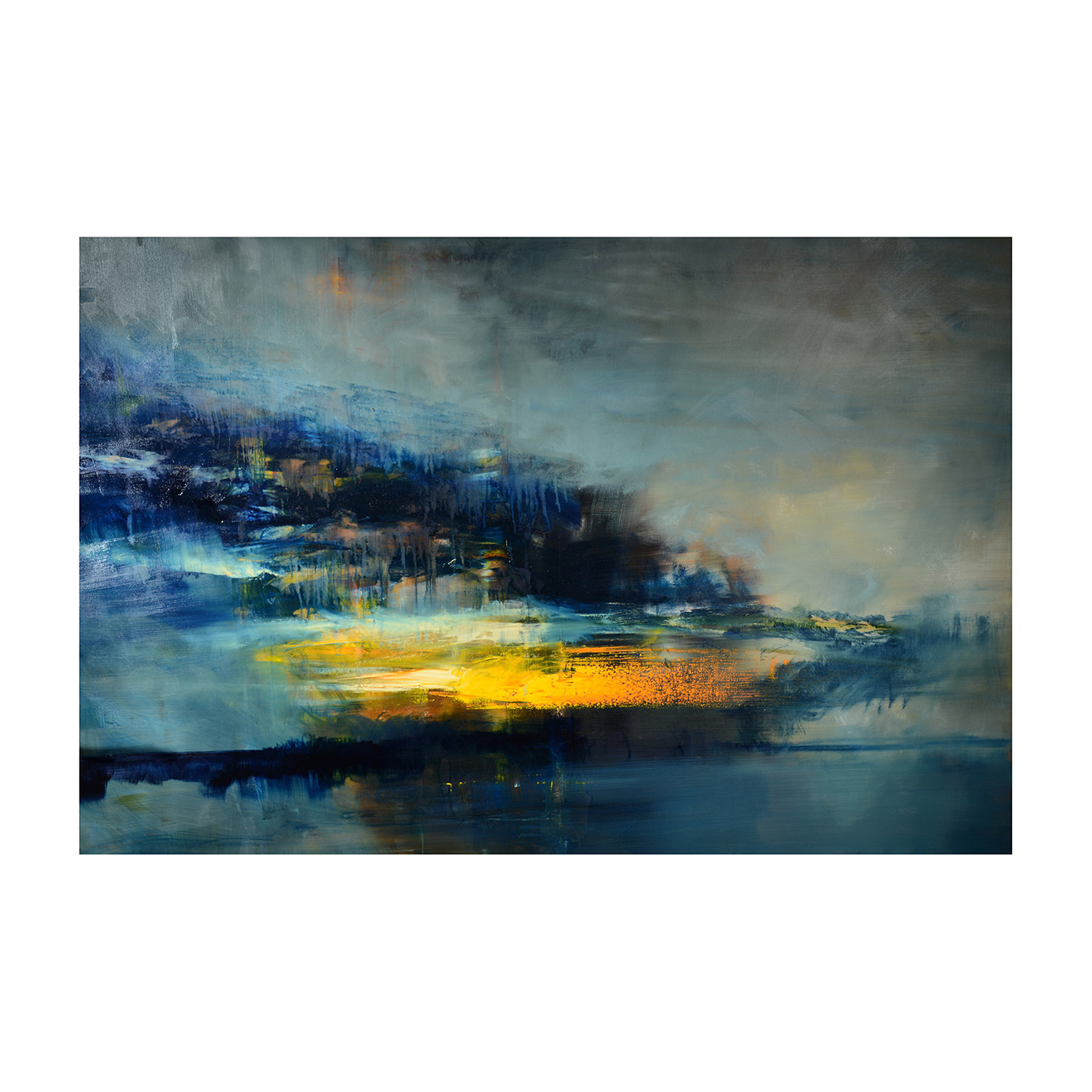 The Big Blue Cloud is a dynamic abstraction of the sky and seascape. This rich, lavish scene is portrayed with opulent brushstrokes in the sky in yellow, and with jewel-like teal and deep blue tones in the sea.