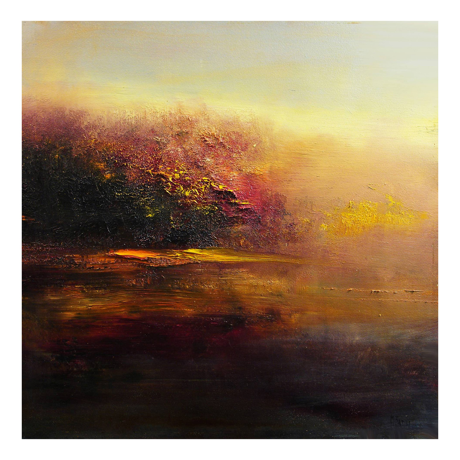 Mill River Sunset by Maurice Sapiro captures the beauty of dusk as the setting sun’s light meets the horizon. This piece features a palette of autumn reds with yellow highlights and violet shadows.