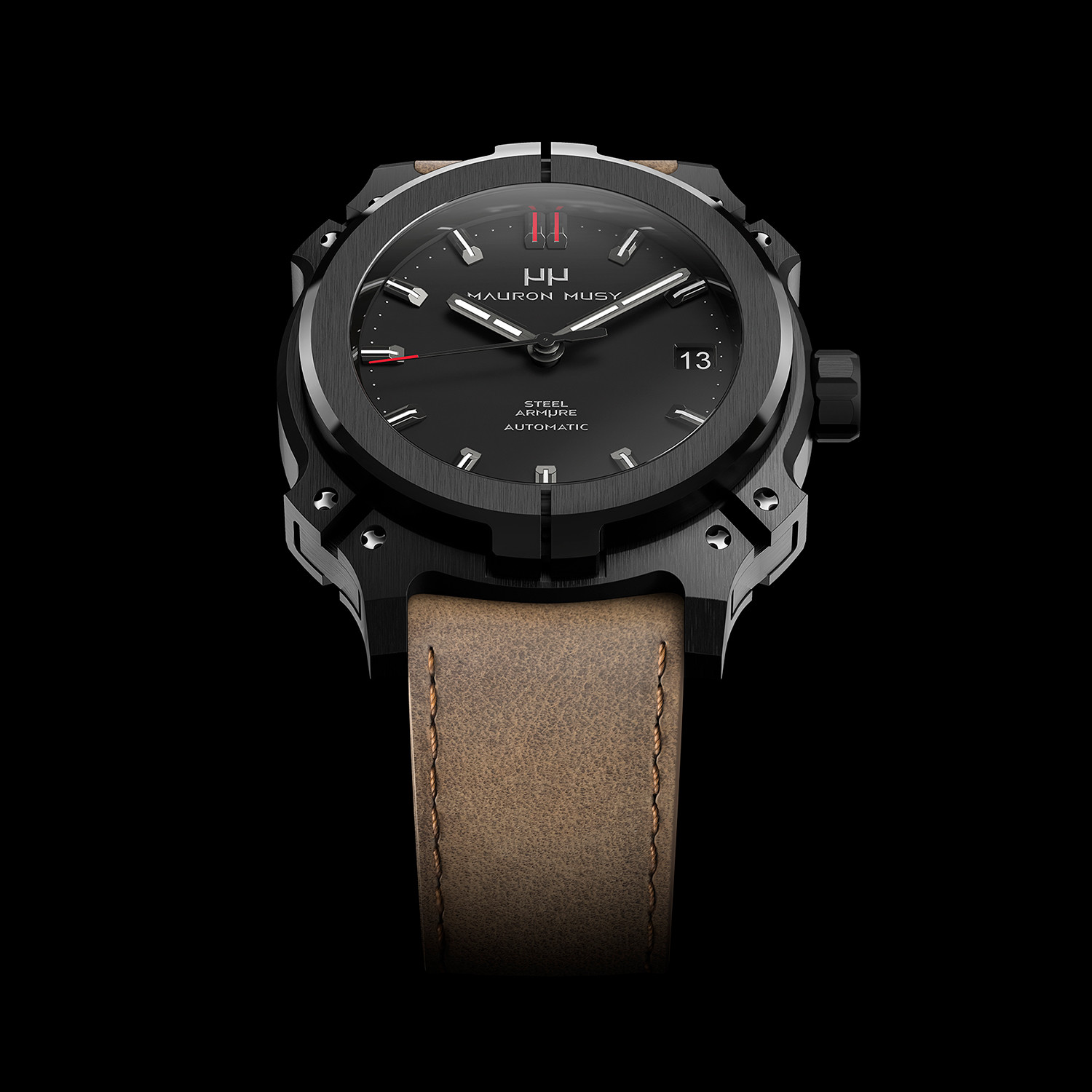 The Black Steel Armure by Mauron Musy is distinguished by a rugged and restrained design that's forged in steel. The case alone uses 36 different components, with meticulously handcrafted finishing. Simple, monochromatic and extremely readable, the Armure is equipped with a self-winding Calibre 39 with a generous 65-hour power reserve, beating at a frequency of 4Hz and featuring a Swiss lever escapement. Sleek and slim - which architecture modeled after a scarab beetle - this timepiece is still robust and imposing, embodying the transcendent power of raw and revolutionary waterproofness.