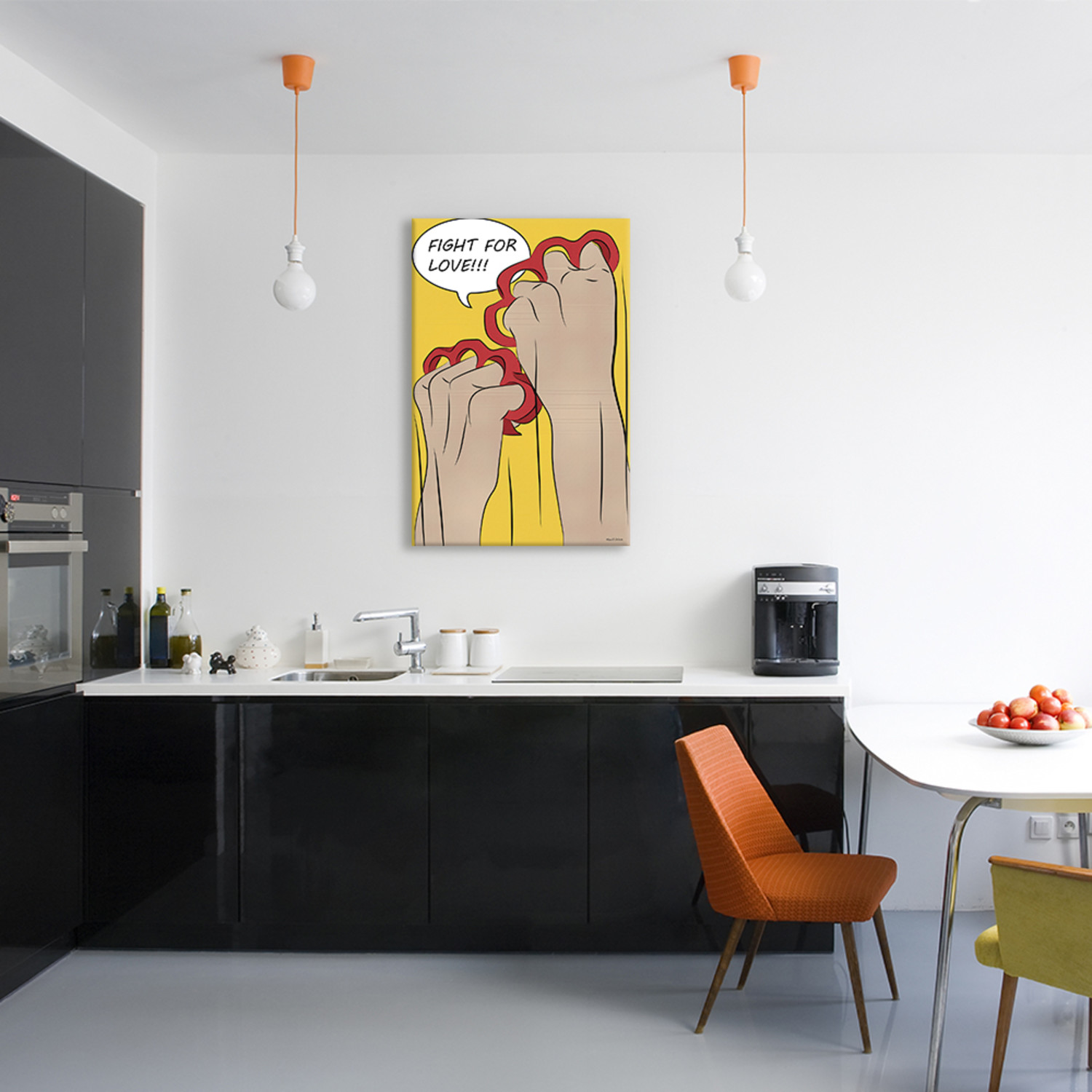 The Fight For Love print is a gripping, arresting image with simple coloring and a poignant design. Unlike cheap posters and paper prints that require additional framing, Giclée canvas artwork offers the texture, look and feel of fine-art paintings. This artwork is crafted in the US with artist-grade canvas. The pieces are professionally hand-stretched and stapled over North American pinewood bars in the gallery wrap style, a method utilized by artists to present artwork in galleries. Fade-resistant archival inks guarantee perfect color reproduction that remains vibrant for decades even when exposed to strong light. Add brilliance in color and exceptional detail to your space with this contemporary and uncompromising style.