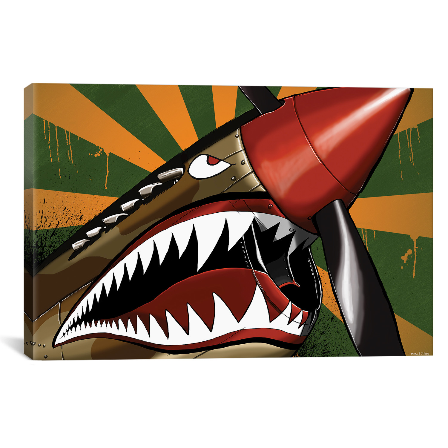 The Warhawk is an inventive print that depicts a retro military plane as a shark. With its eye-catching yellow-and-green striped background, it's a gritty, expressive work that's sure to be a conversation-starter in any space. Unlike cheap posters and paper prints that require additional framing, Giclée canvas artwork offers the texture, look and feel of fine-art paintings. This artwork is crafted in the US with artist-grade canvas. The pieces are professionally hand-stretched and stapled over North American pinewood bars in the gallery wrap style, a method utilized by artists to present artwork in galleries. Fade-resistant archival inks guarantee perfect color reproduction that remains vibrant for decades even when exposed to strong light. Add brilliance in color and exceptional detail to your space with this contemporary and uncompromising style.