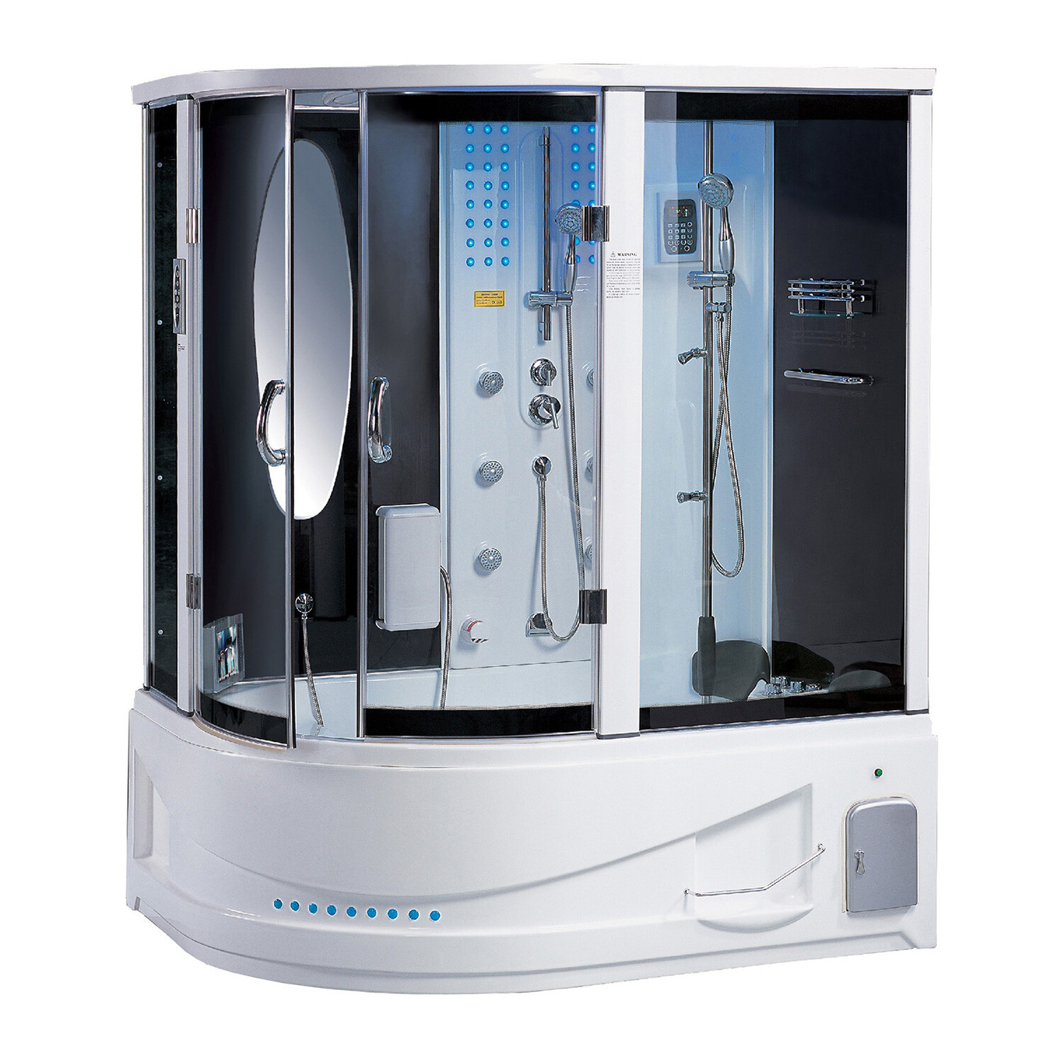The perfectly designed acrylic Steam Shower unit is reinforced with durable fiberglass backing, as well as solid stainless steel framing and fixtures including the door handles, towel racks, and shampoo racks. The beautiful tempered glass guarantees strength and longevity. Plus this Steam Shower Unit fits nicely in the corner to help maximize bathroom floor space. What more could you ask for?