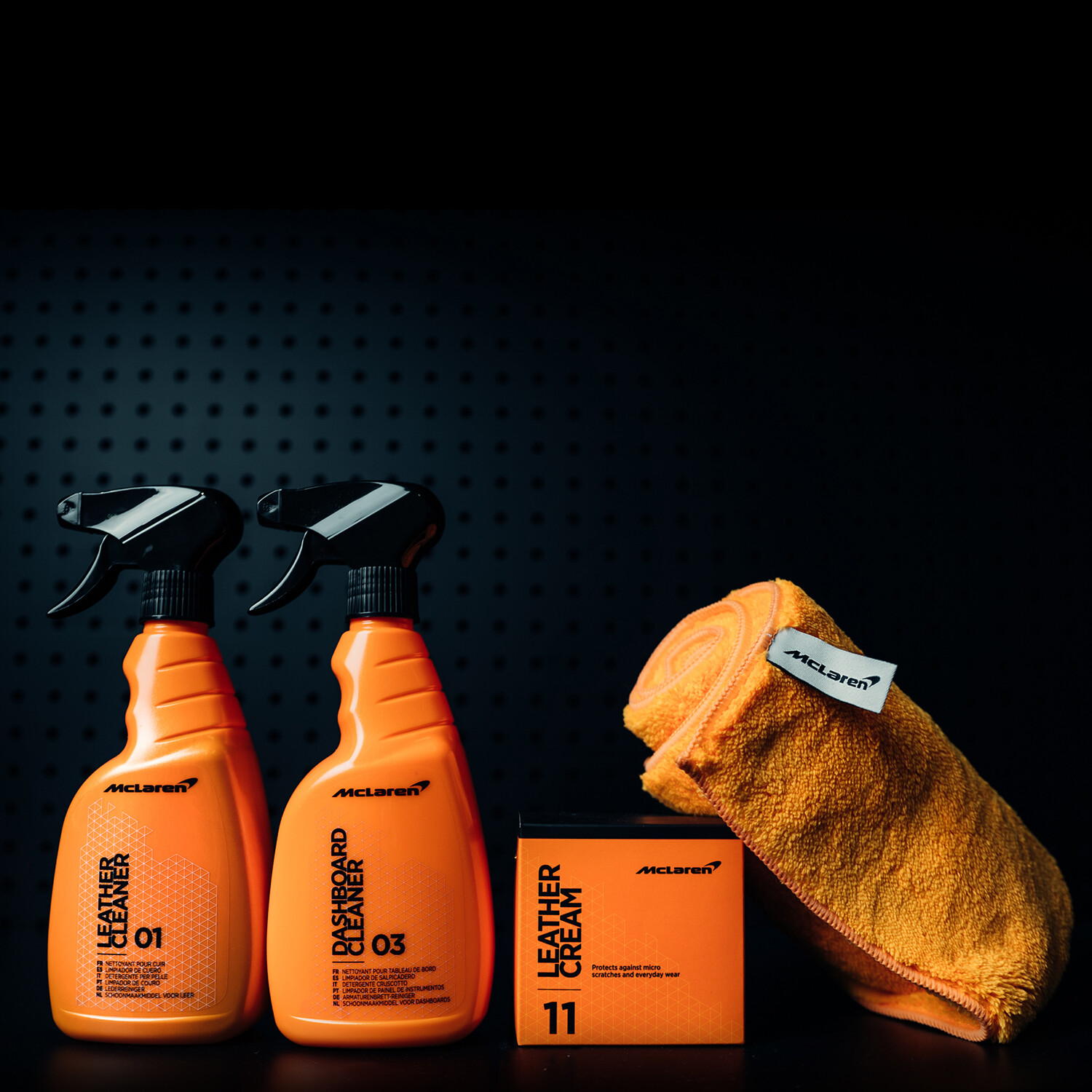 The Mclaren Interior Essential Care Kit features the absolute must have products you need to clean and condition your cockpit. It includes the Dashboard Cleaner, Leather Cleaner, Leather Cream, one applicator pad, and two McLaren microfiber towels!