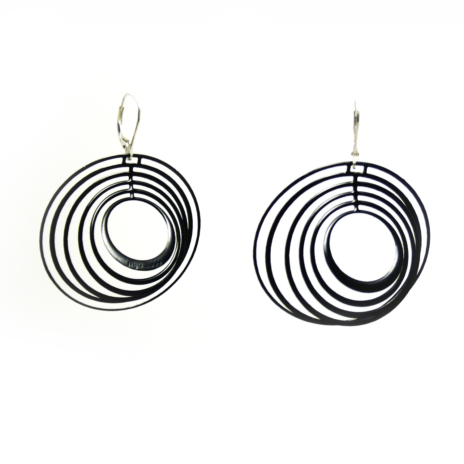 Over looking like a “lady who lunches”? Then say goodbye to conventional, stuffy jewelry and find your inner funk with these circular, hypnotizing black earrings. Innovative in their design, each piece comprises of multiple flat discs made from flexible powder-coated steel. This material allows you to expand or contract them, resulting in 3D shapes purely of your creation. These pieces are perfect for a night out on the town—sassy without sacrificing sophistication. Embrace a more modern and darling look with Melissa Borrell’s transformable designs.