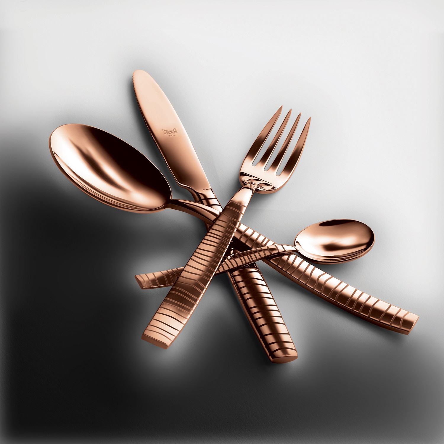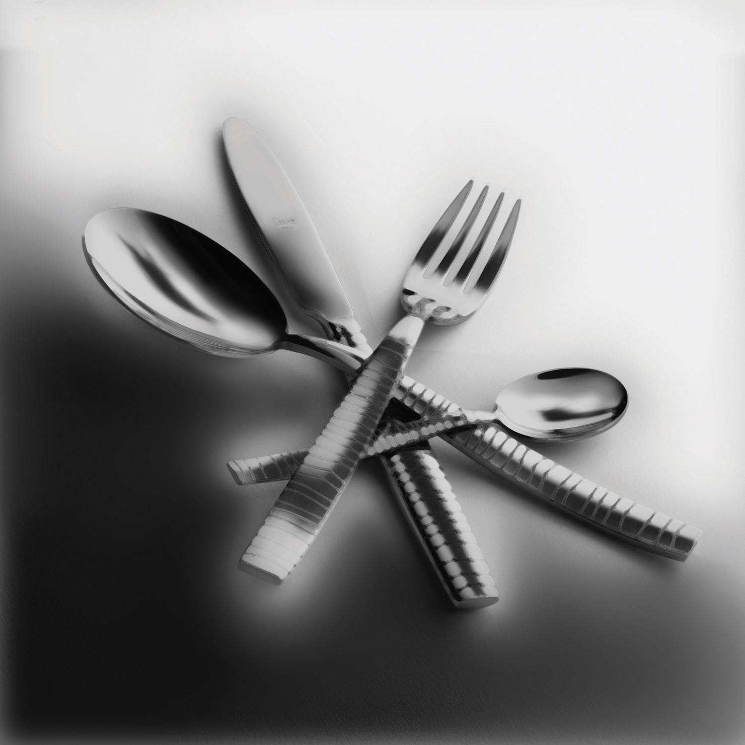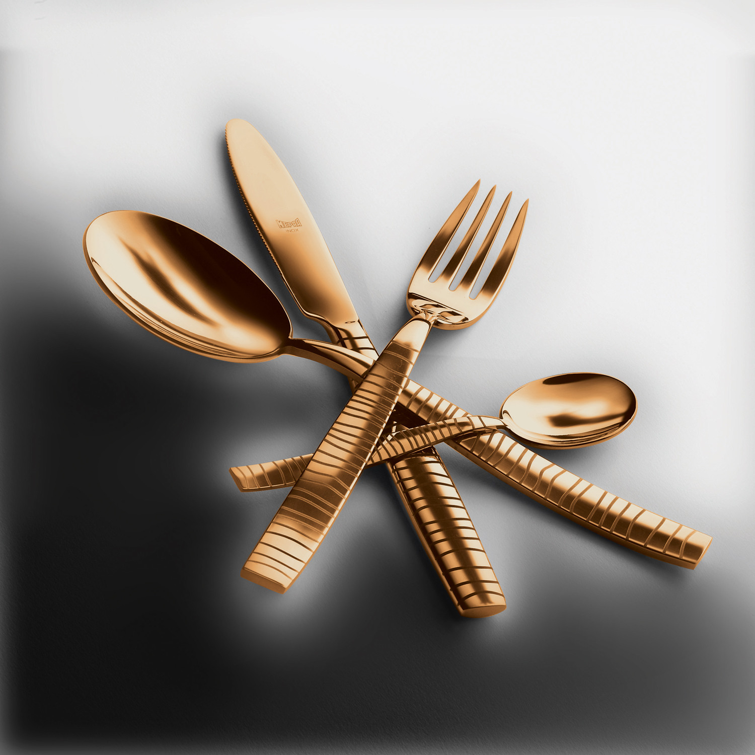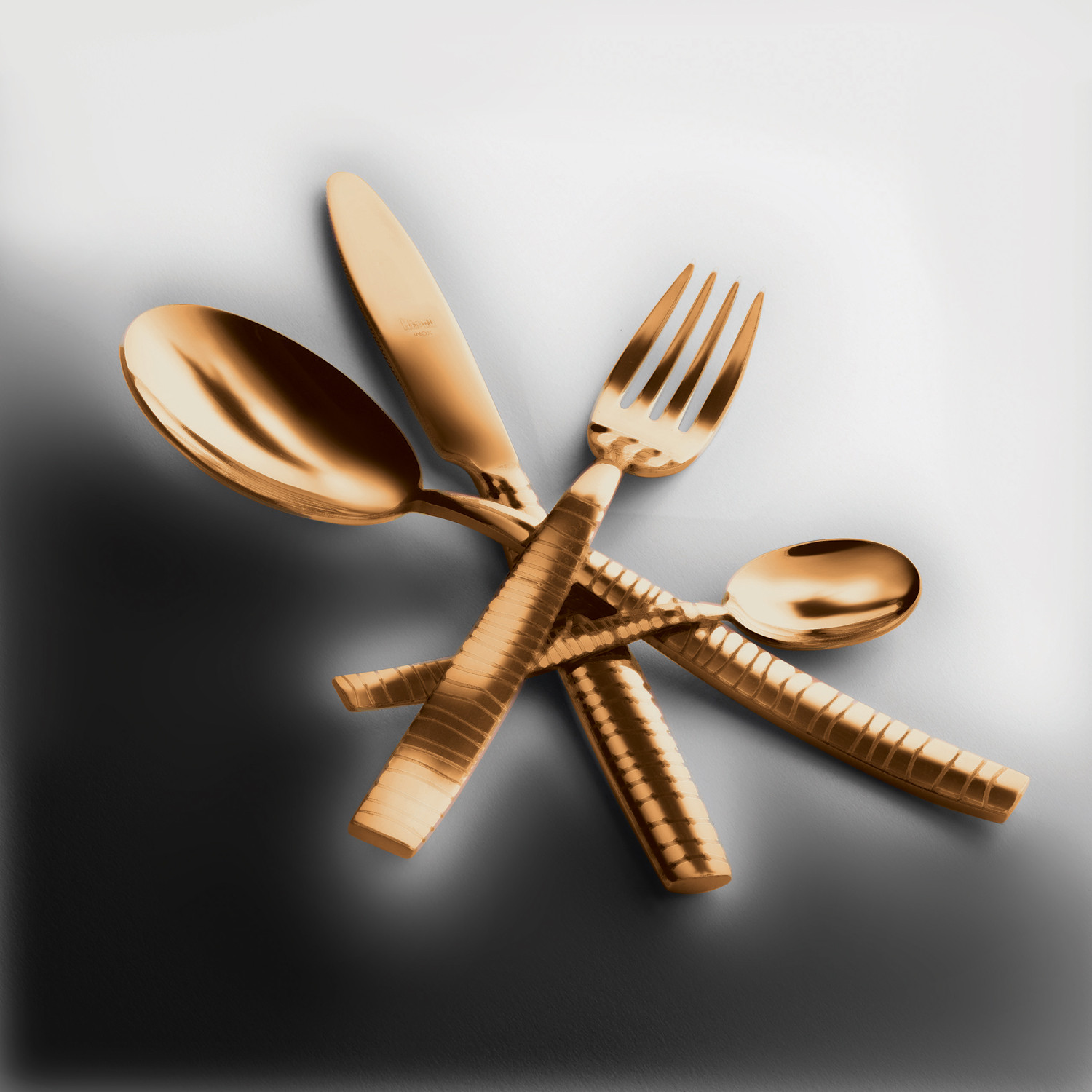 The Tigre 5 Pc Flatware set is inspired by the untamed beauty of a wild tiger, capturing every stripe with high definition detail. Crafted in stainless steel, this set comes in your choice of finish, with every metallic from smooth silver to beautiful bronze represented in this refined repertoire. Get a set for every guest at your gourmet table.