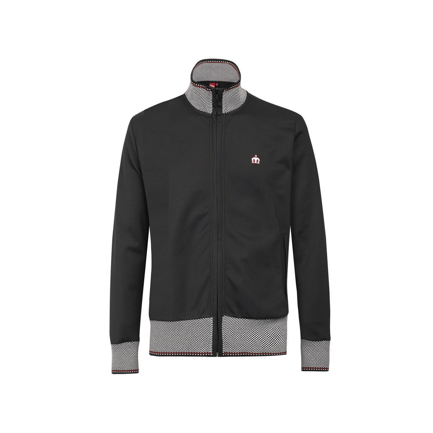 A key retro piece, this checker board tipped men's track top with block colored body, features a high funnel neck, two front pockets and the iconic Merc crown embroidered felt badge on the left chest.