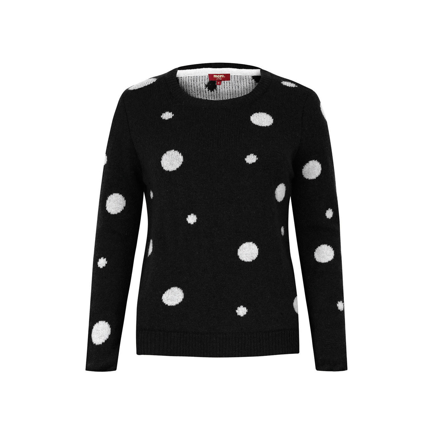 Stay warm with this dotted jumper. The black and white coloration is Mod and reminiscent of the swinging 60s while the soft fabric blend will keep you cozy all winter long. This sweater has a soft ribbed hem, cuffs and collar.