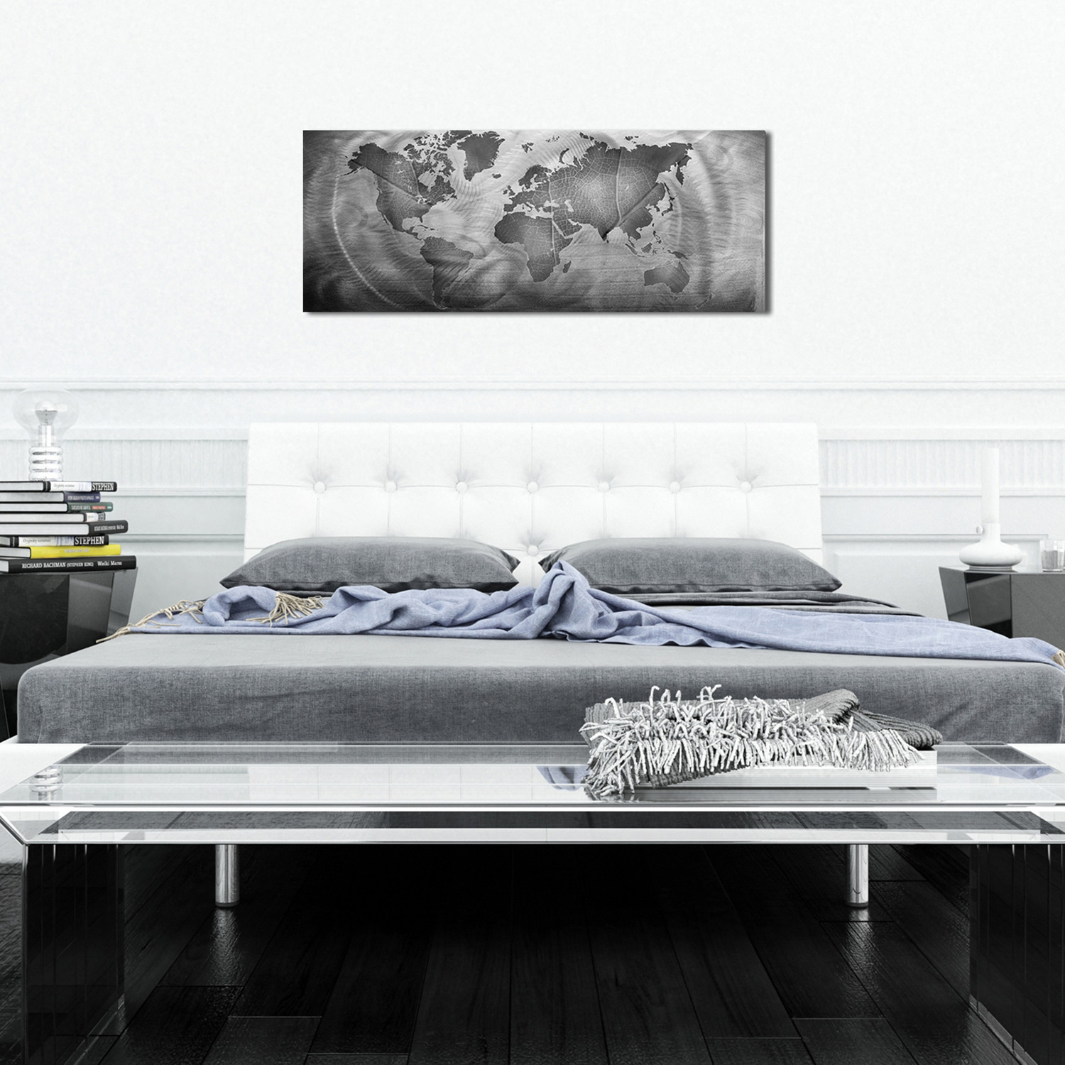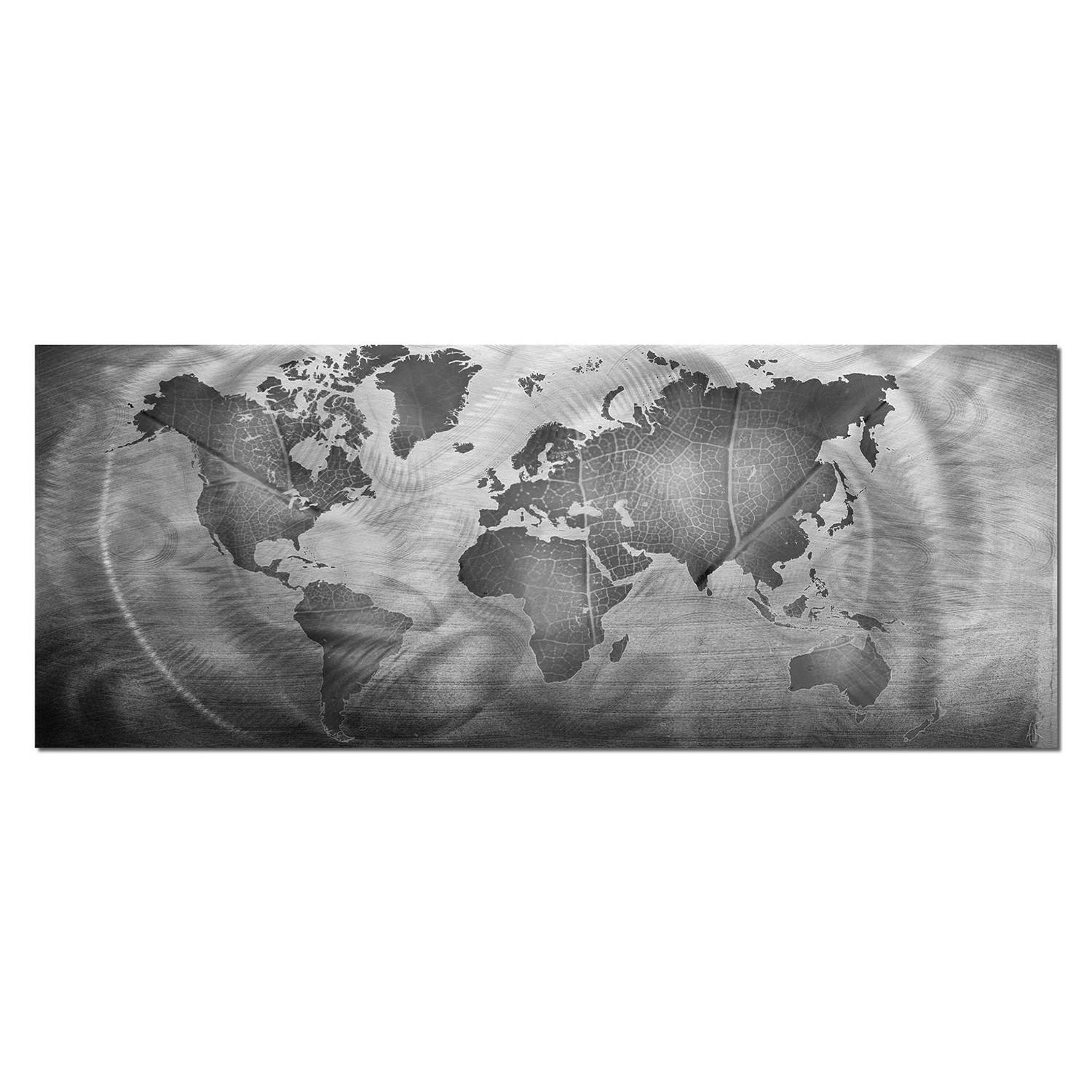 Perhaps the most remarkable details seen in this modern piece are found in the earthy, leafy texture subtly hidden in each of the continents. It's derived from a unique process that starts with either an original visual that Metal Art Studio manipulates, and then applies to a sleek metal panel in high-definition, giving it a unique eggshell giclée finish. The thrilling contrast between the dark land and the light sea makes for a wonderful monochromatic, minimalist accent piece that is contemporary and functional.