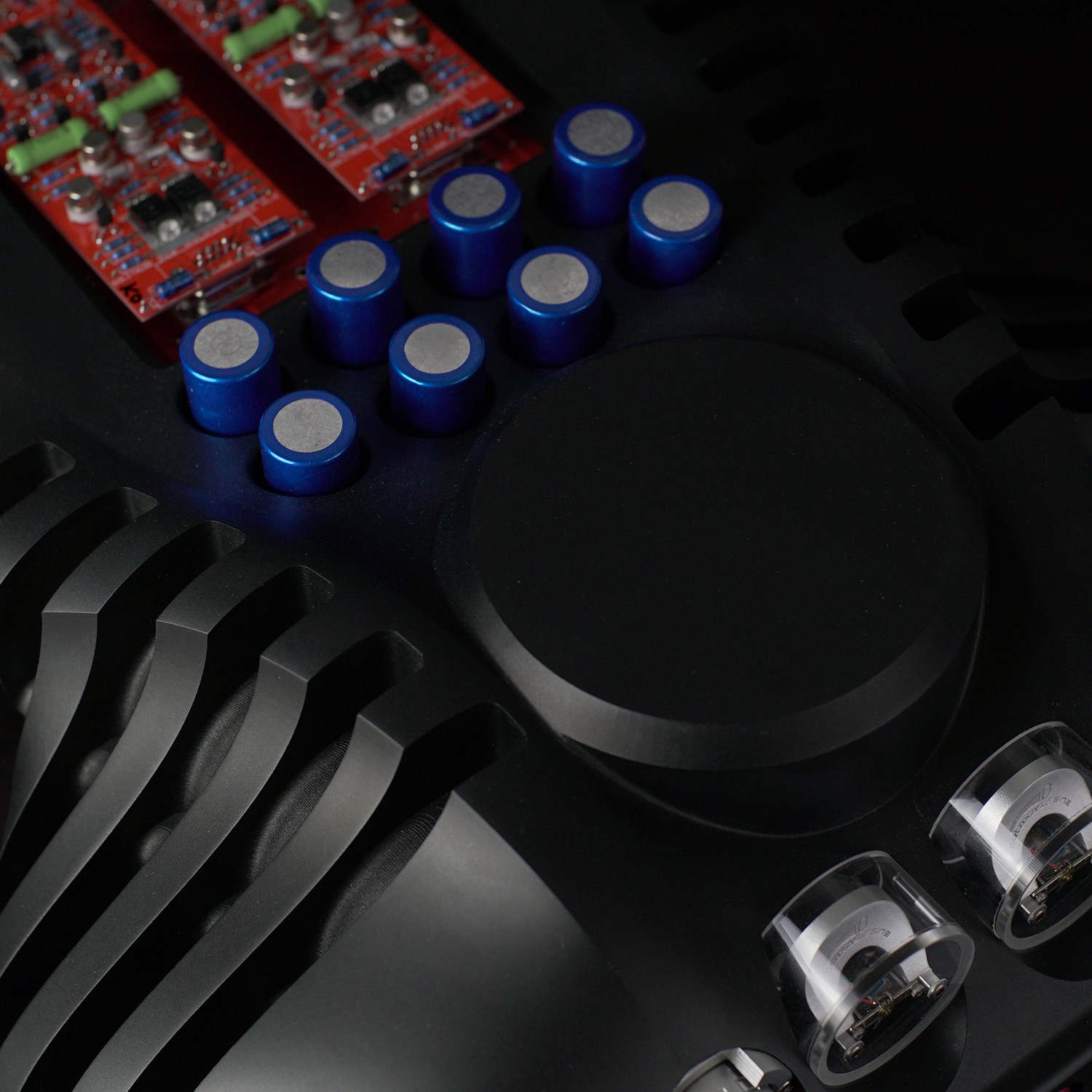 The rear panel supports custom-designed RCA inputs and binding posts and every other component including the output transistors, are directly soldered to the single, dual-mono printed circuit board. The board becomes one large module which can be quickly and easily removed to facilitate any circuit updates or servicing requirements, making an integrated amp that seamlessly hooks up to your audio system