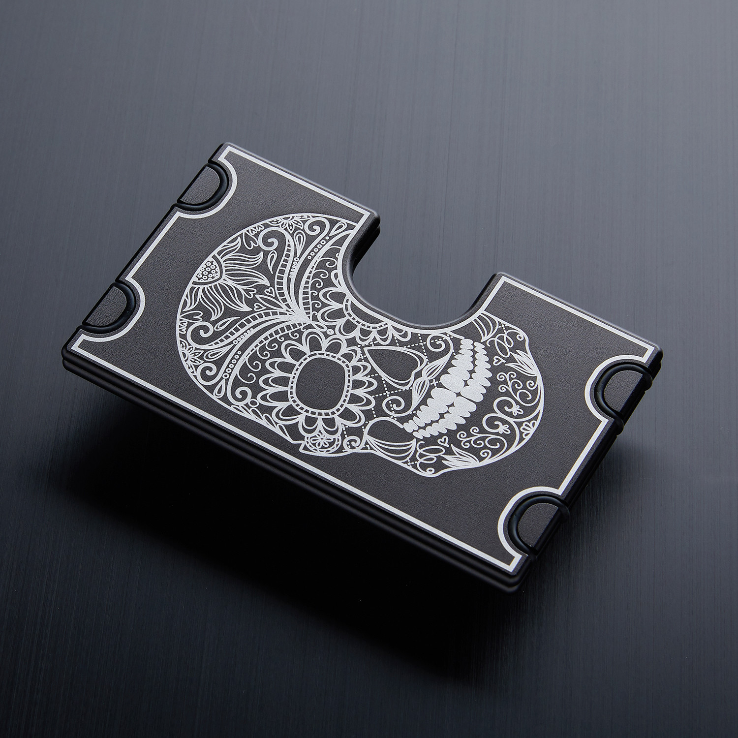 Creating this gorgeous Día de los Muertos Metahl wallet required machining, hand working, sand blasting, and anodizing. The design is engraved at a very shallow depth, creating different refractory patterns of light at various angles. The end result is a slim and sturdy wallet that holds up to 10 cards, or a combination of cash and cards together.