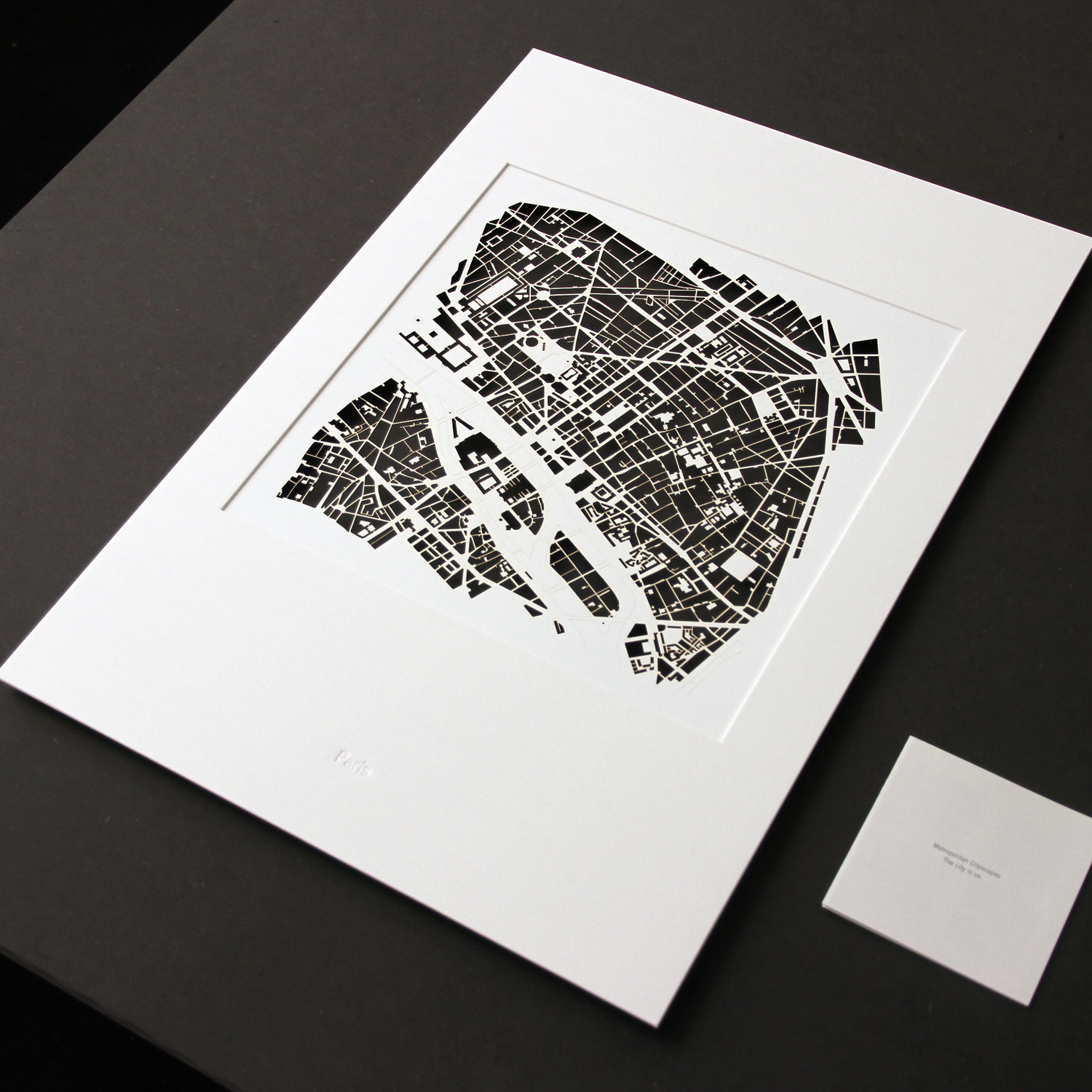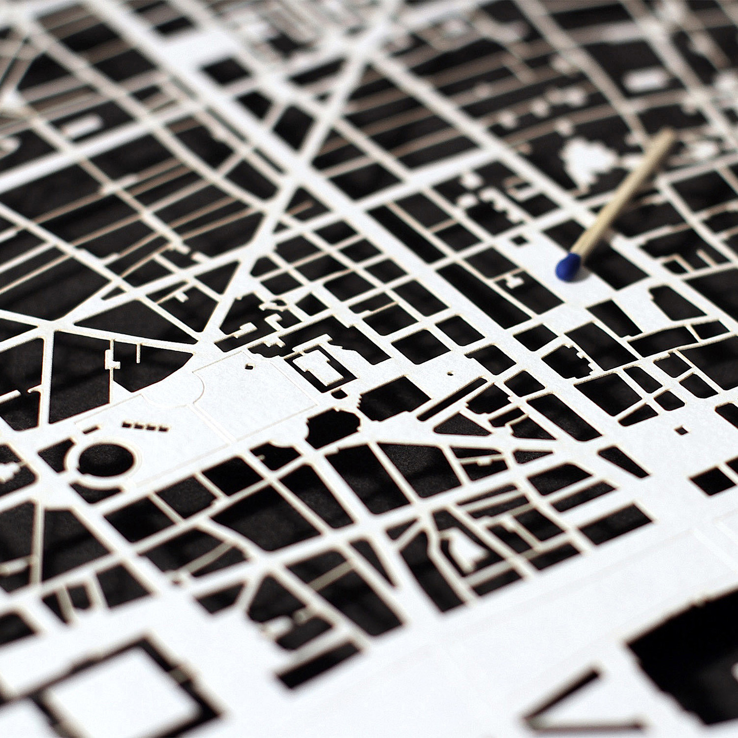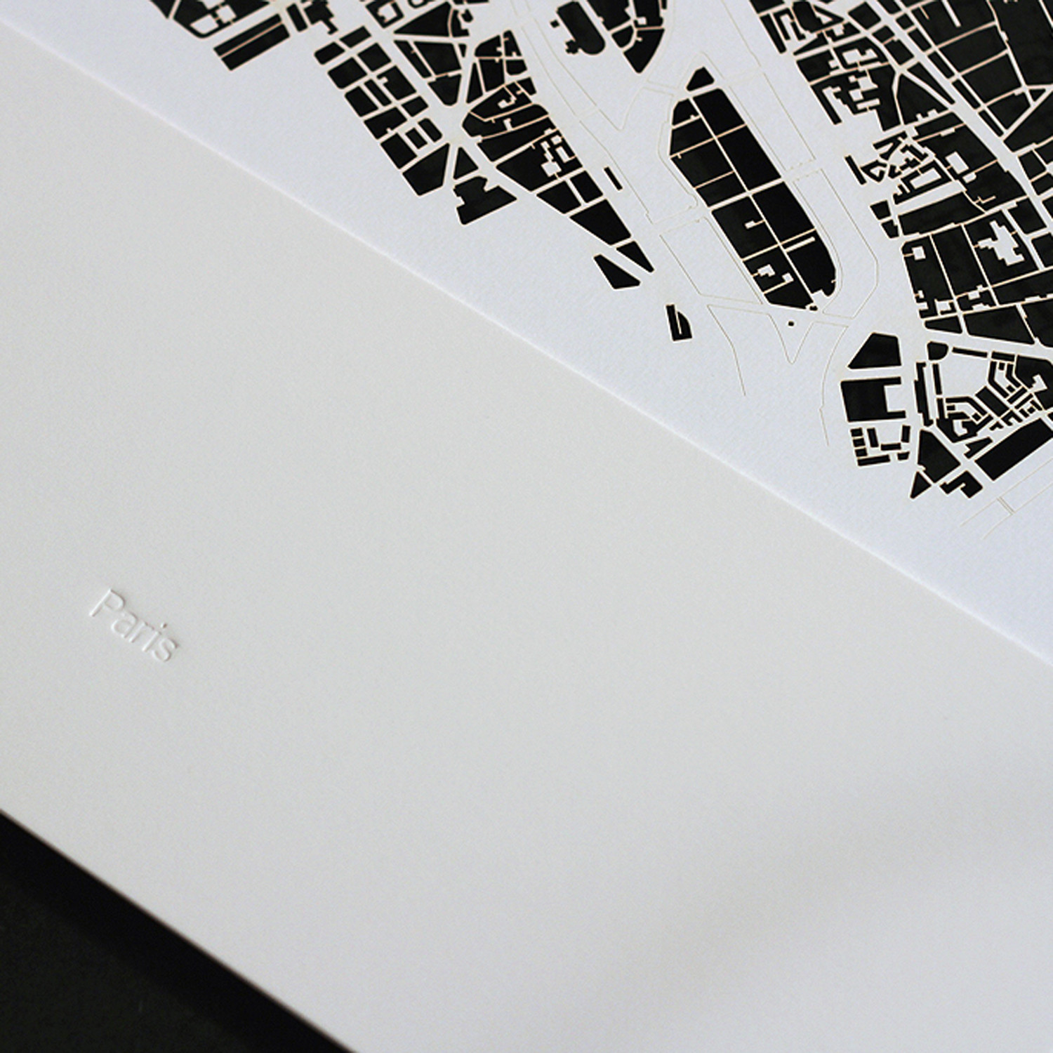 This intricately lasercut map of Paris is a fine addition to any modern home. The process of translating a city map into a laser cut art piece re-imagines the city as a beautifully abstract series of geometric shapes. The use of white paper plays with light and shadow as the map's appearance changes with subtlety depending upon the time of day.