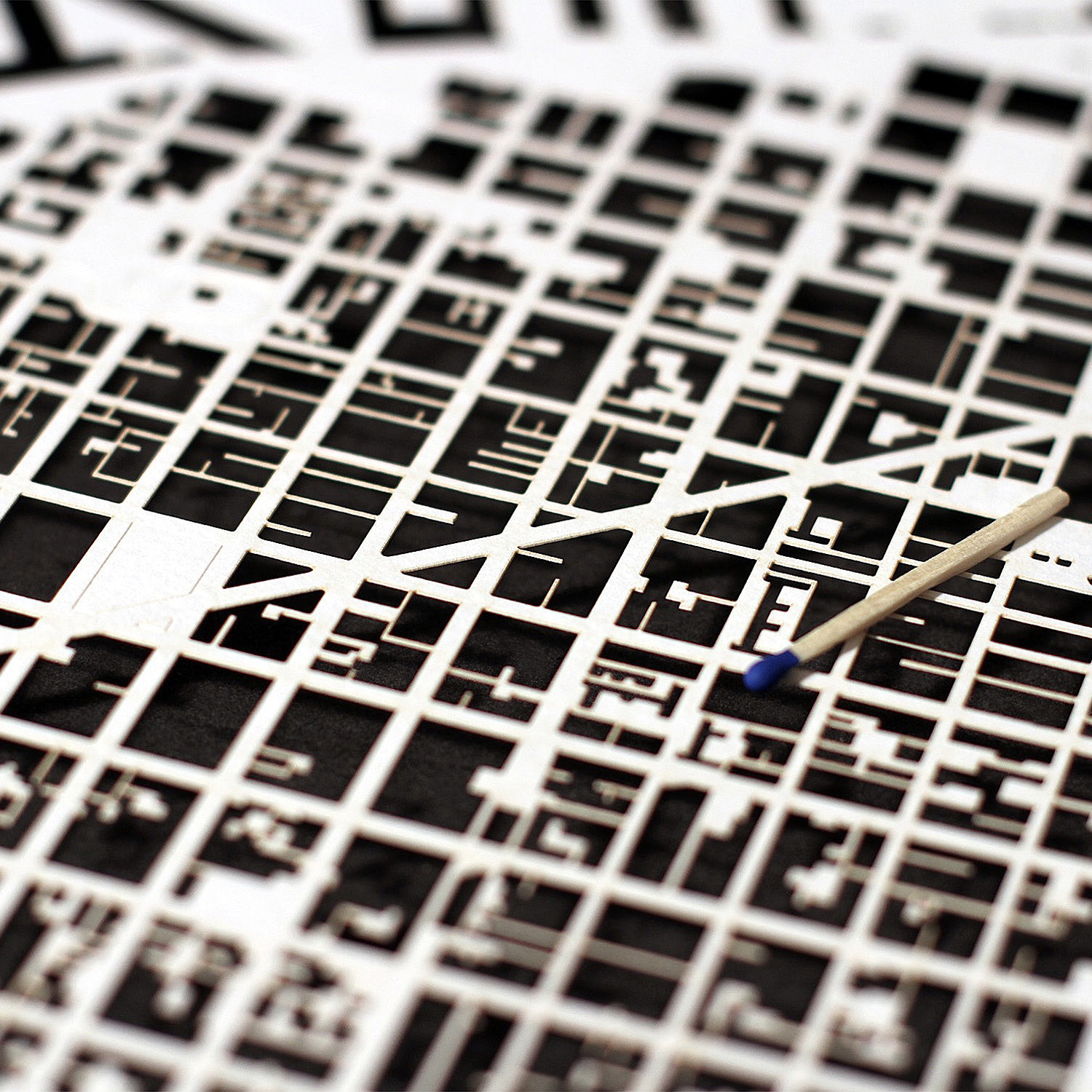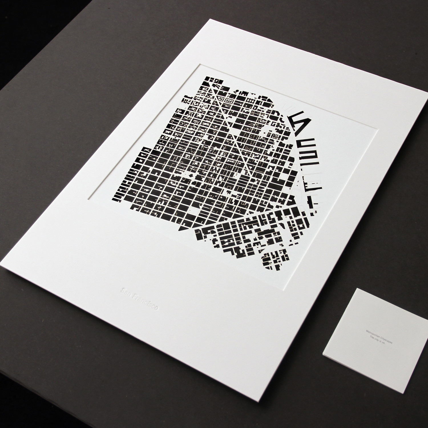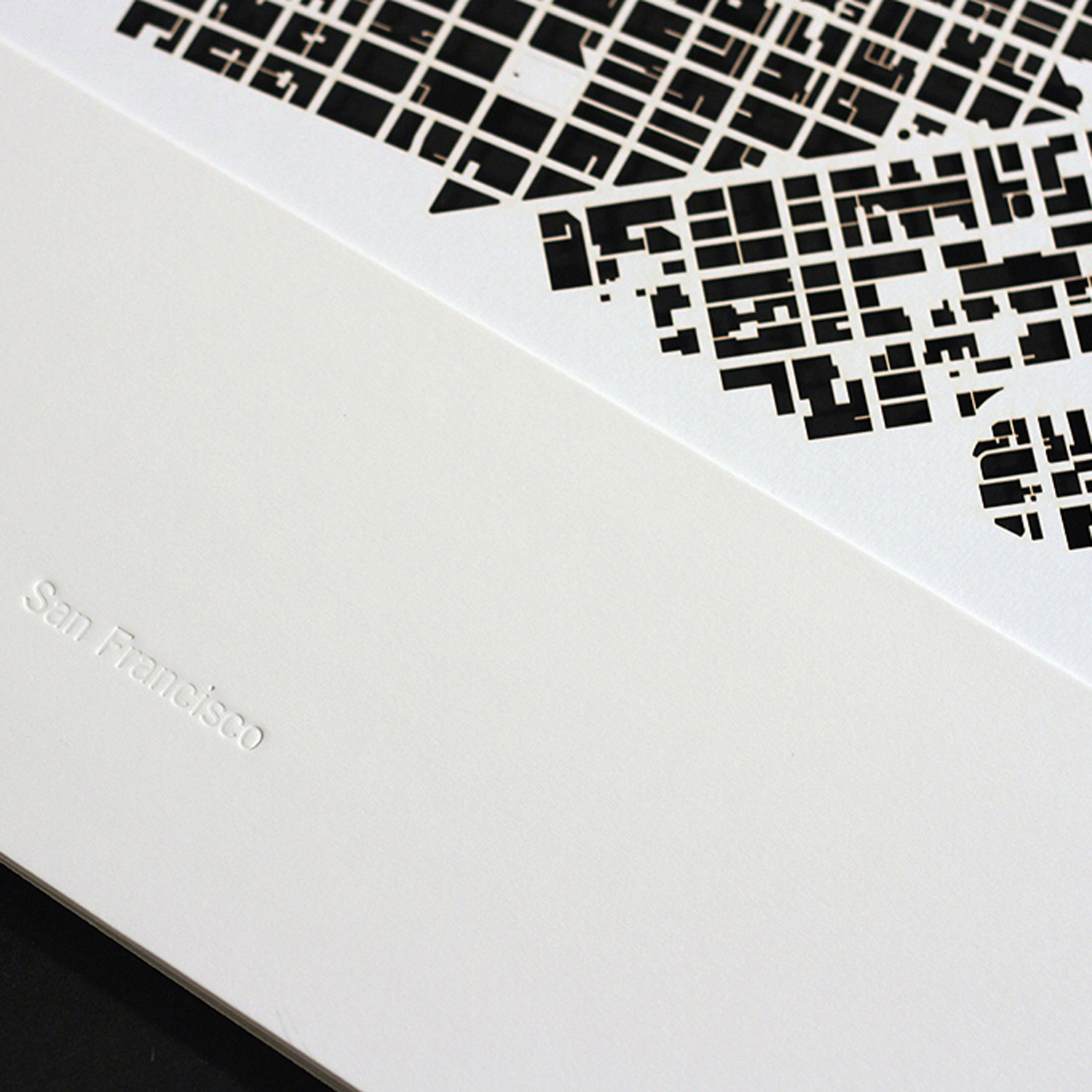 This intricately lasercut map of San Francisco is a fine addition to any modern home. The process of translating a city map into a laser cut art piece re-imagines the city as a beautifully abstract series of geometric shapes. The use of white paper plays with light and shadow as the map's appearance changes with subtlety depending upon the time of day.