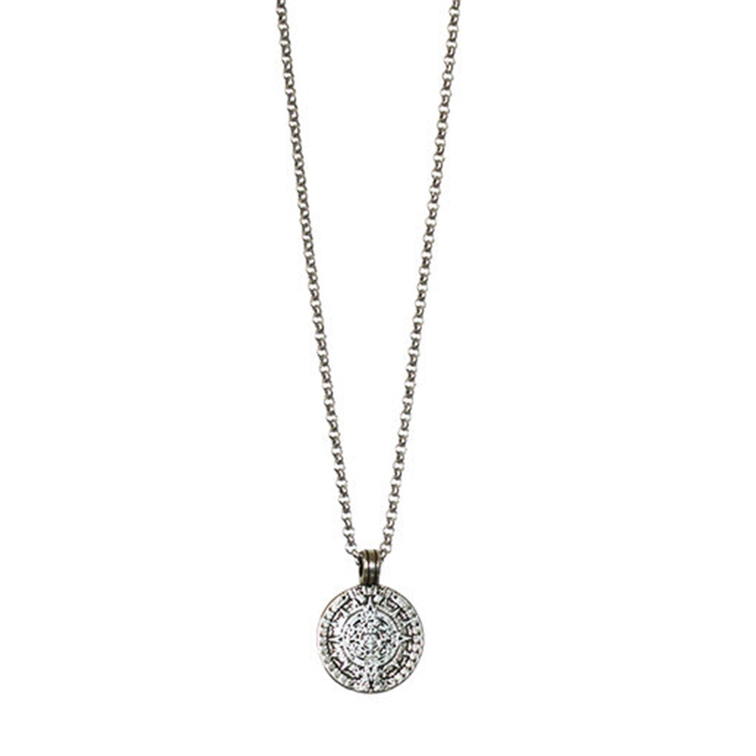 Handmade sterling silver plated coin hangs on a stainless steel chain.