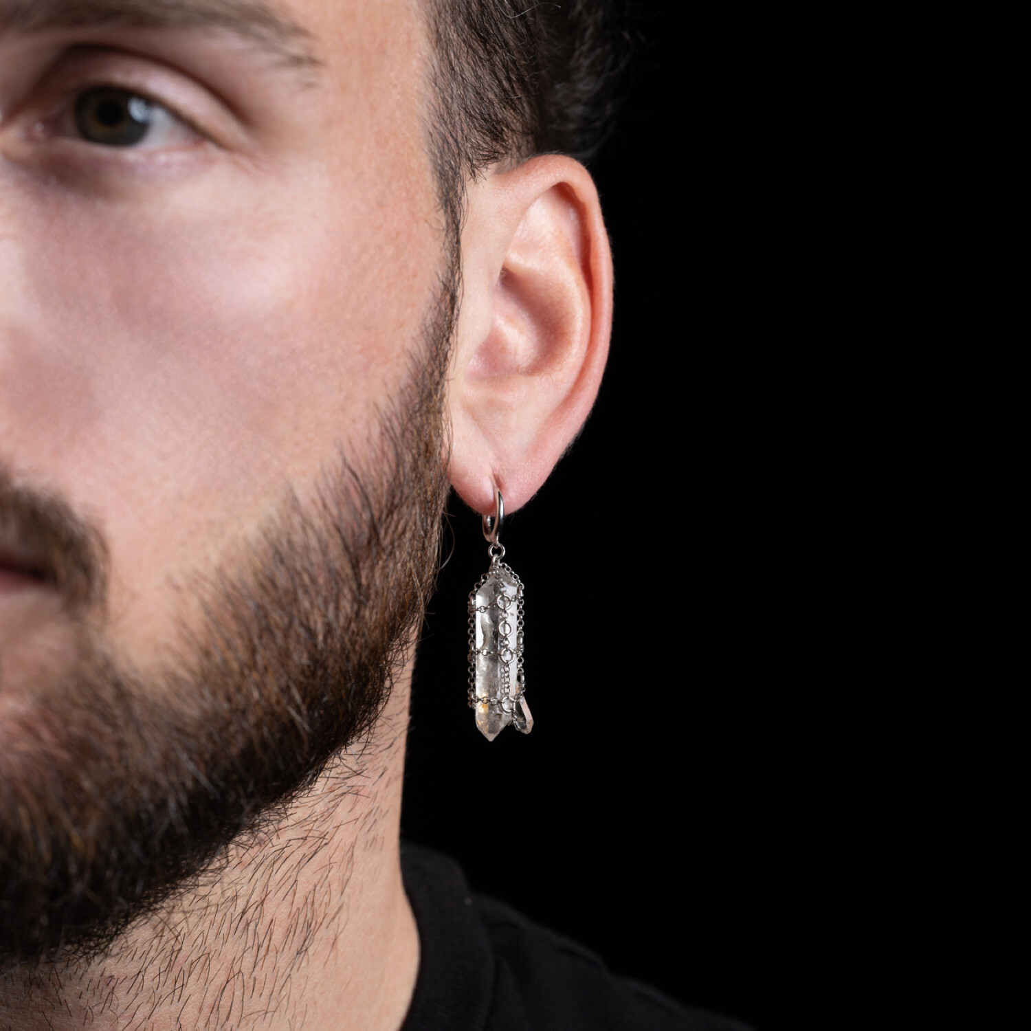 This unique earring is made with real quartz gemstone and oxidized sterling silver. The stone is a natural shape that makes it unique, and it's caged in a way that makes it look like it's floating.