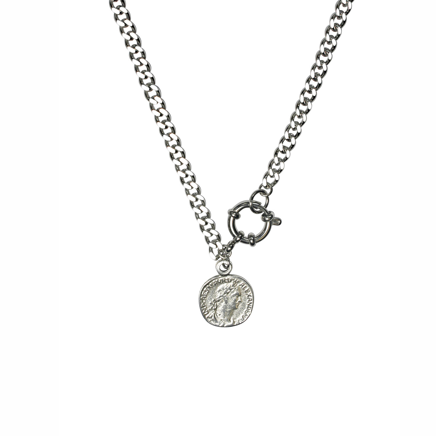 Handcrafted from a sterling silver plated coin and high quality stainless steel chain, this Coin Chain Necklace is the perfect choice for those who appreciate unique jewelry.