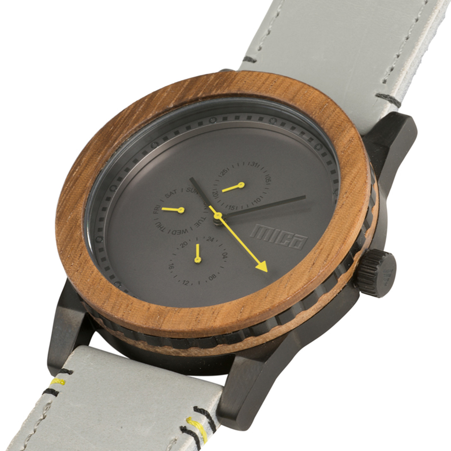 The Owen collection from Mica is characterized by its minimalist, monochromatic dial, and its unusual wooden bezel. Offering a subtle, but still distinctive vintage flair, every watch looks equally at home on the wrist of design-savvy urban dweller, or the wrist of silver screen stars of the 1960s.