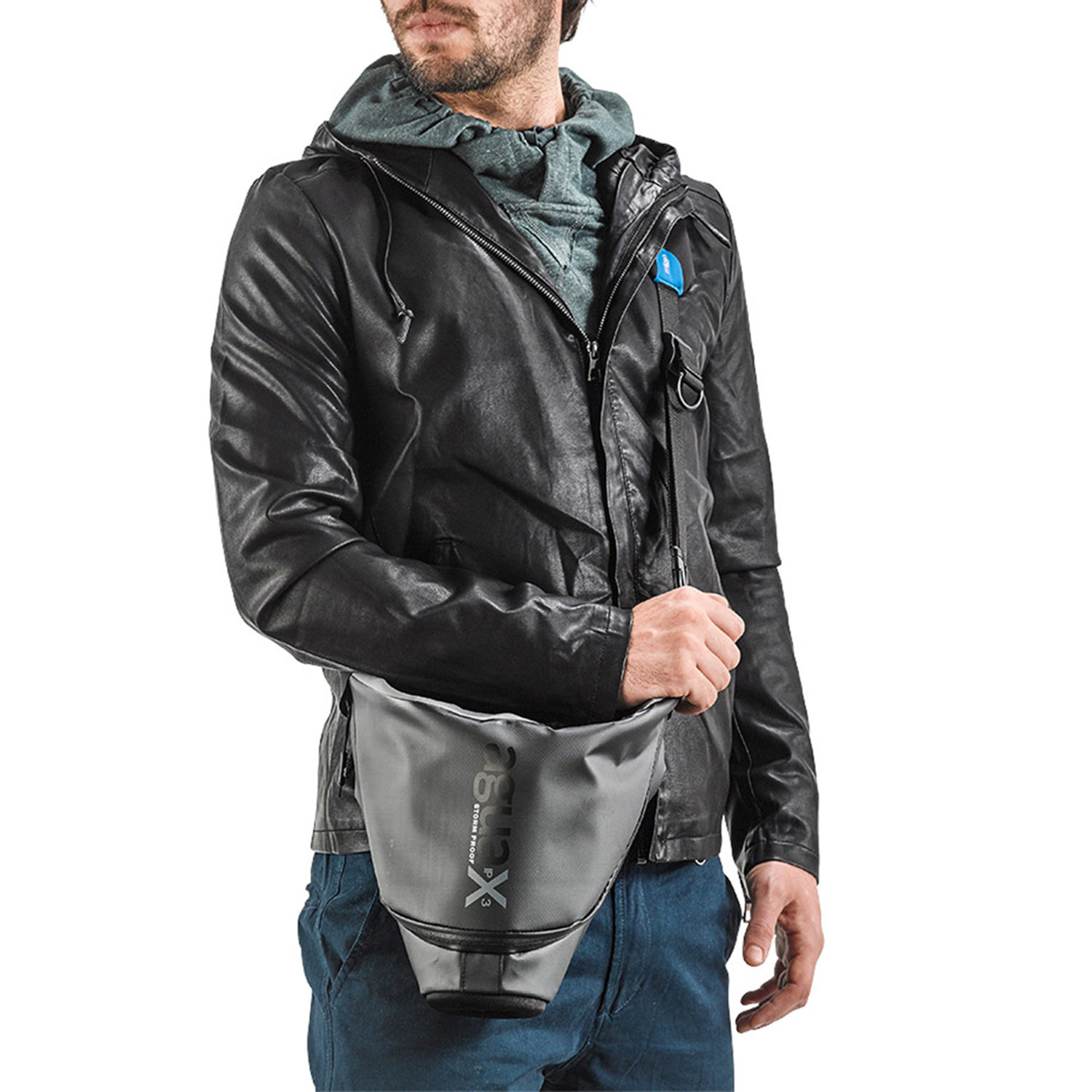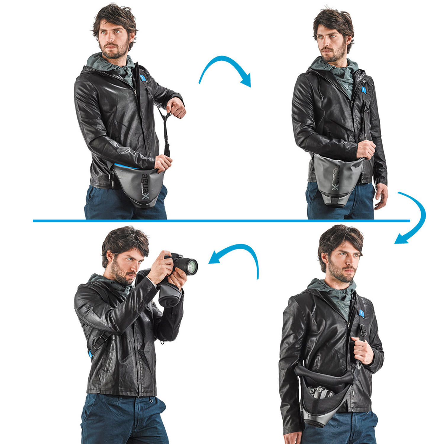Suitable for entry-level medium size DSLRs and Superzoom (bridge) cameras, the Agua Stormproof Quick-Draw Holster is an IPX3-standard storm-proof camera-carrier. It is different than common water-resistant camera carriers because it allows intuitive quick-drawing of the camera. Agua 35's quick- adjusting padded strap allows perfect fit to the user's body. The Agua 35's special structure allows the photographer to comfortably carry his camera close to the body in any weather — rain, snow, sandstorm or even in a dense urban environment, without worrying about the fate of his expensive equipment ”— and draw it quickly and with ease at the right moment to capture a perfect shot.