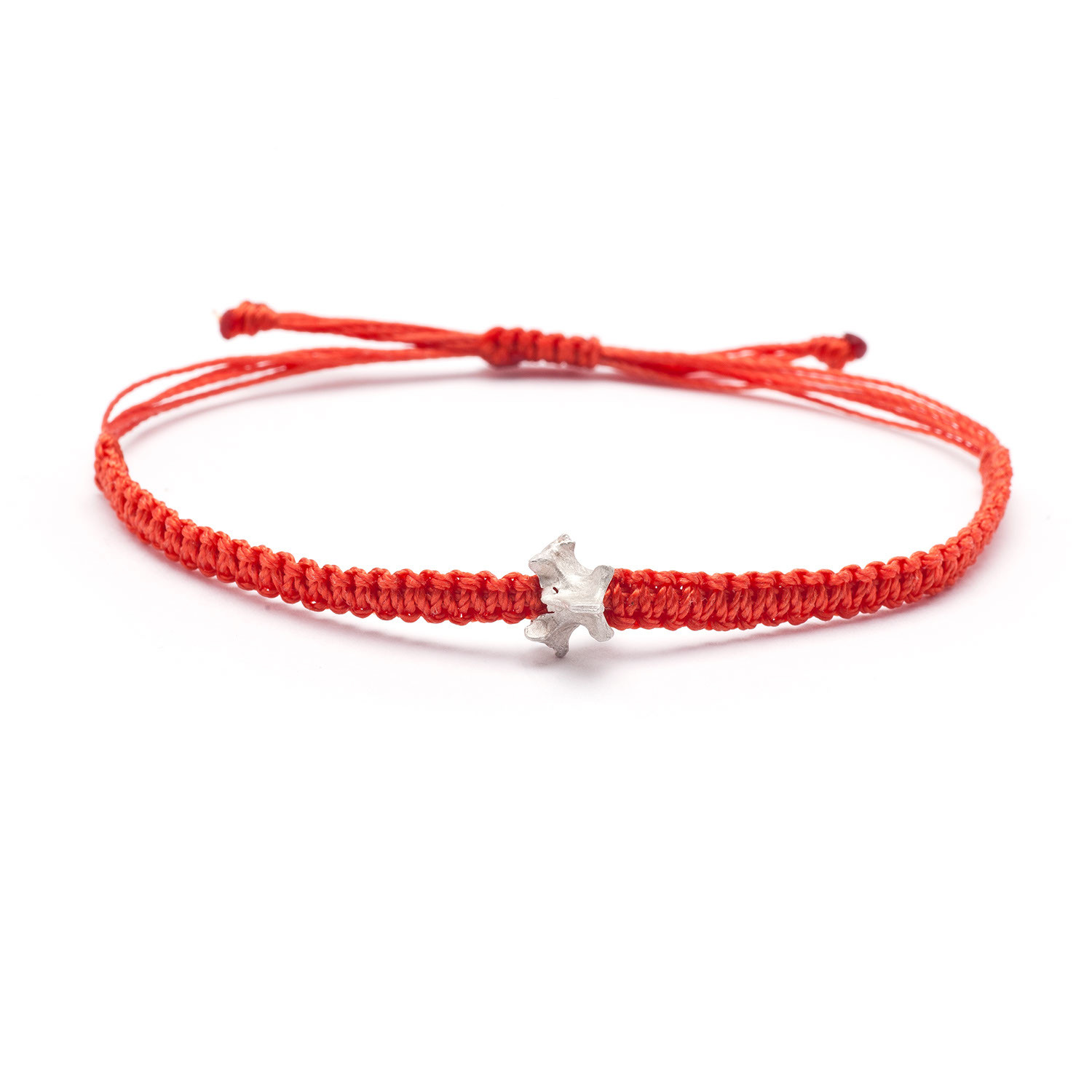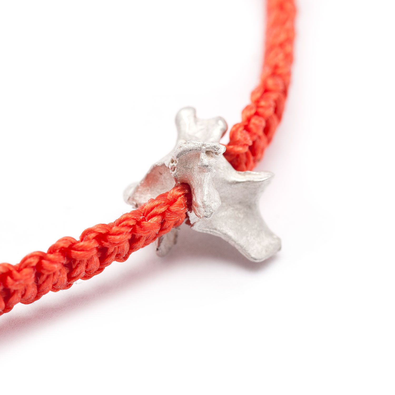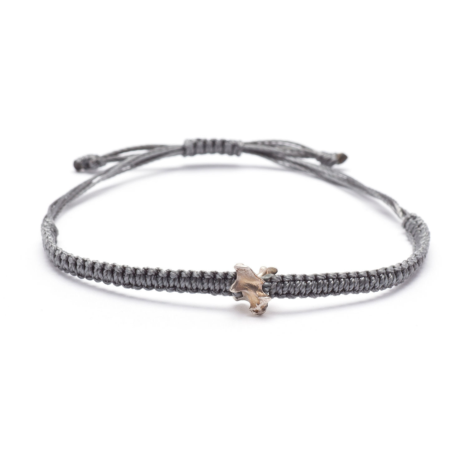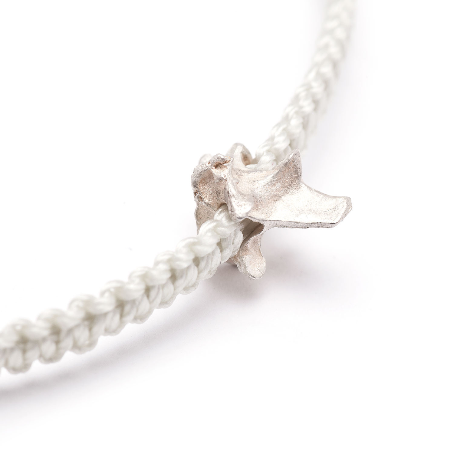 A vertebrae cast in solid silver on an adjustable woven band is the ultimate wear-all-the-time piece. The more it’s worn, the more this bracelet will evolve on the wearer.